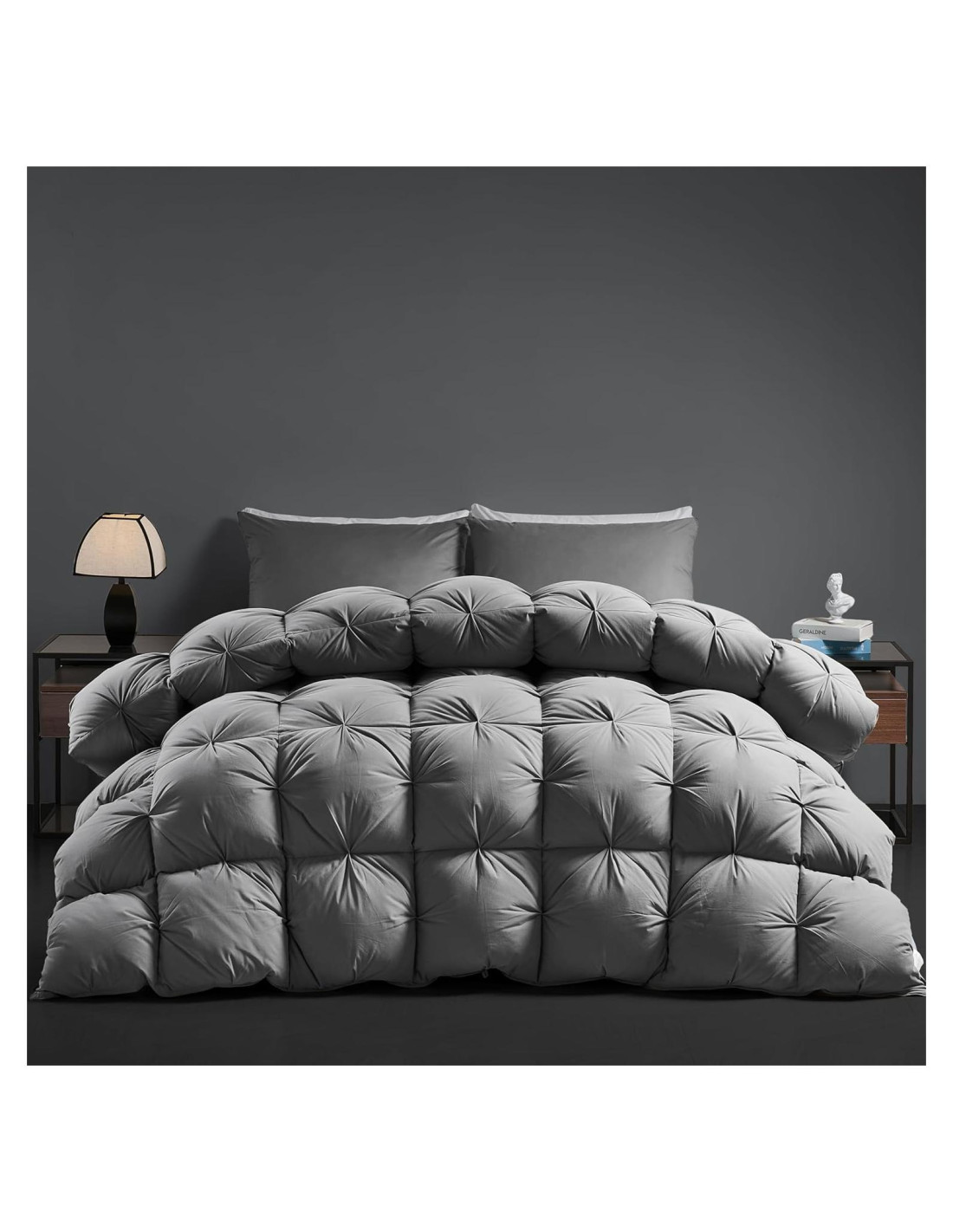 - [USO TODO EL AÑO] El lujoso edredón de plumón proporciona excelente calidez y propiedades de enfriamiento para comodidad durante todo el año para la mayoría de las personas, mientras presenta un diseño de pliegue para un estilo moderno único en el hogar. Disfruta de un descanso y recuperación inigualables toda la noche con nuestro edredón de todas las estaciones. Disponible en 4 tamaños: Cal King 108x98 pulgadas (274.3x248.9 cm), 82 oz (2.3 kg); King 106x90 pulgadas (269.2x228.6 cm), 70 oz (1.98 kg); Queen 90x90 pulgadas (228.6x228.6 cm), 60 oz (1.7 kg); Twin 68x90 pulgadas (172.7x228.6 cm), 46 oz (1.3 kg).