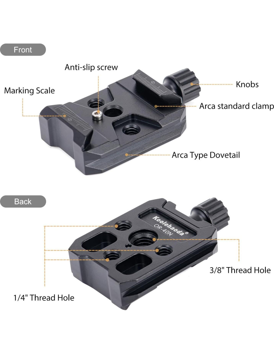 - Interfaces Multifuncionales para Amplia Compatibilidad - Agujero roscado de 1/4" y 3/8" en la base de montaje es compatible con trípode, estabilizadores, gimbal, monitor de video, monopie; Interfaz estándar Arca-Swiss de 38mm en la parte inferior, la base de montaje puede encajarse en la ranura de la tarjeta arca, también puede funcionar como una placa elevadora para una cámara DSLR montada en un soporte tipo L Arca o placa tipo Arca.