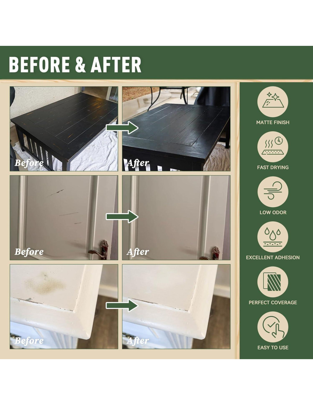 - Acabado Mate y Durabilidad: Formulado con materiales de alta calidad, esta pintura para retoque proporciona un acabado mate que es a prueba de agua y duradero. Cubre eficazmente las imperfecciones de la superficie, dando a tus superficies de madera una apariencia mate natural mientras resiste el desgaste.