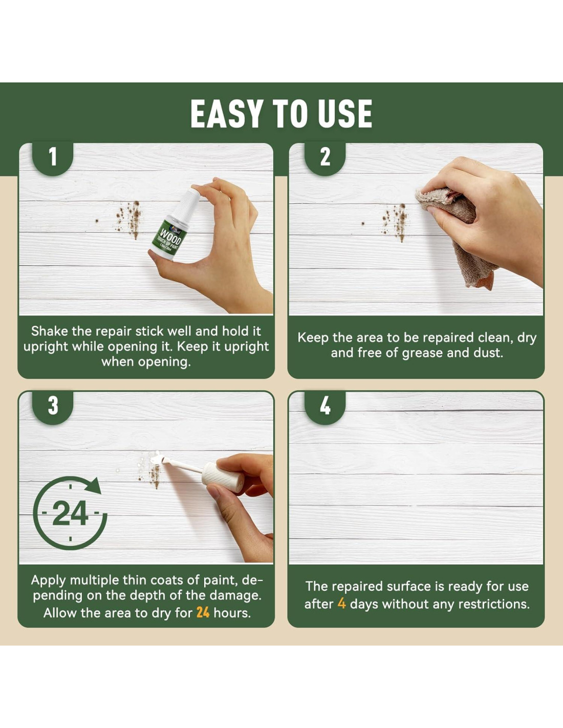 - Amplia Aplicación: Ideal para reparar rayones, astillas y manchas en diversas superficies de madera como muebles, gabinetes, puertas, mesas y cómodas. Adecuado para uso tanto en interiores como en exteriores.