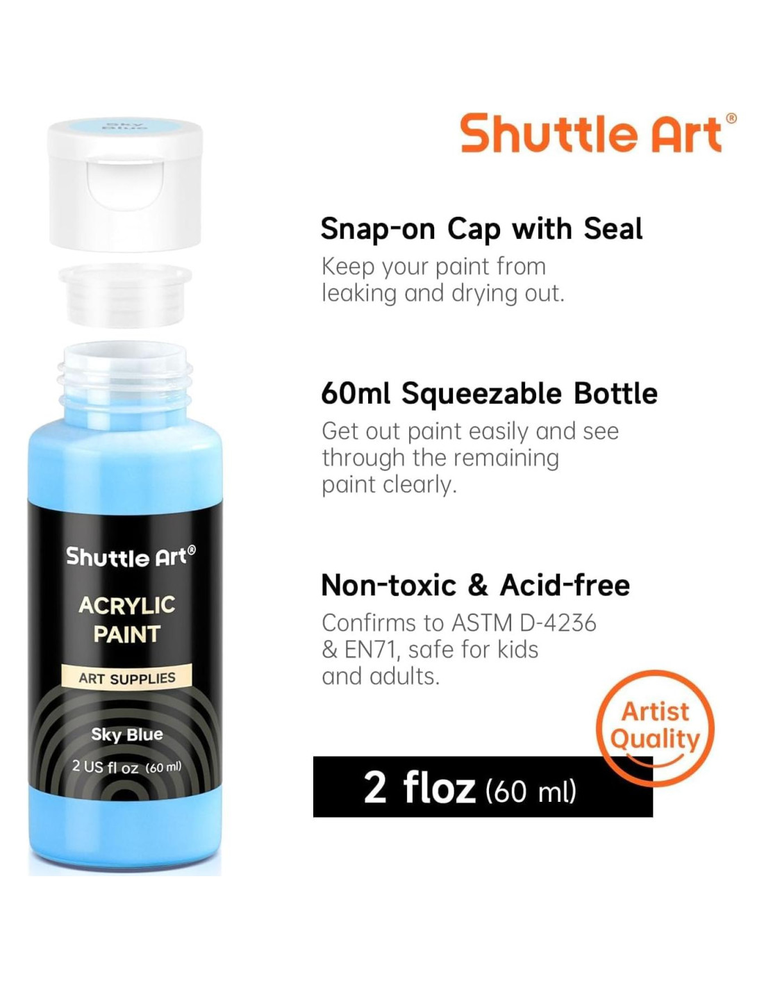 - 78 COLORES ÚNICOS + 2 BLANCO Y NEGRO: El set de pintura acrílica Shuttle Art de 92 piezas contiene 78 colores únicos y 2 pinturas acrílicas blanca y negra en botellas de 60 ml/2 oz y 12 pinceles, incluyendo los colores más comúnmente utilizados e inspiradores colores fluorescentes y metálicos para tus proyectos artísticos, ideal para pintar y manualidades