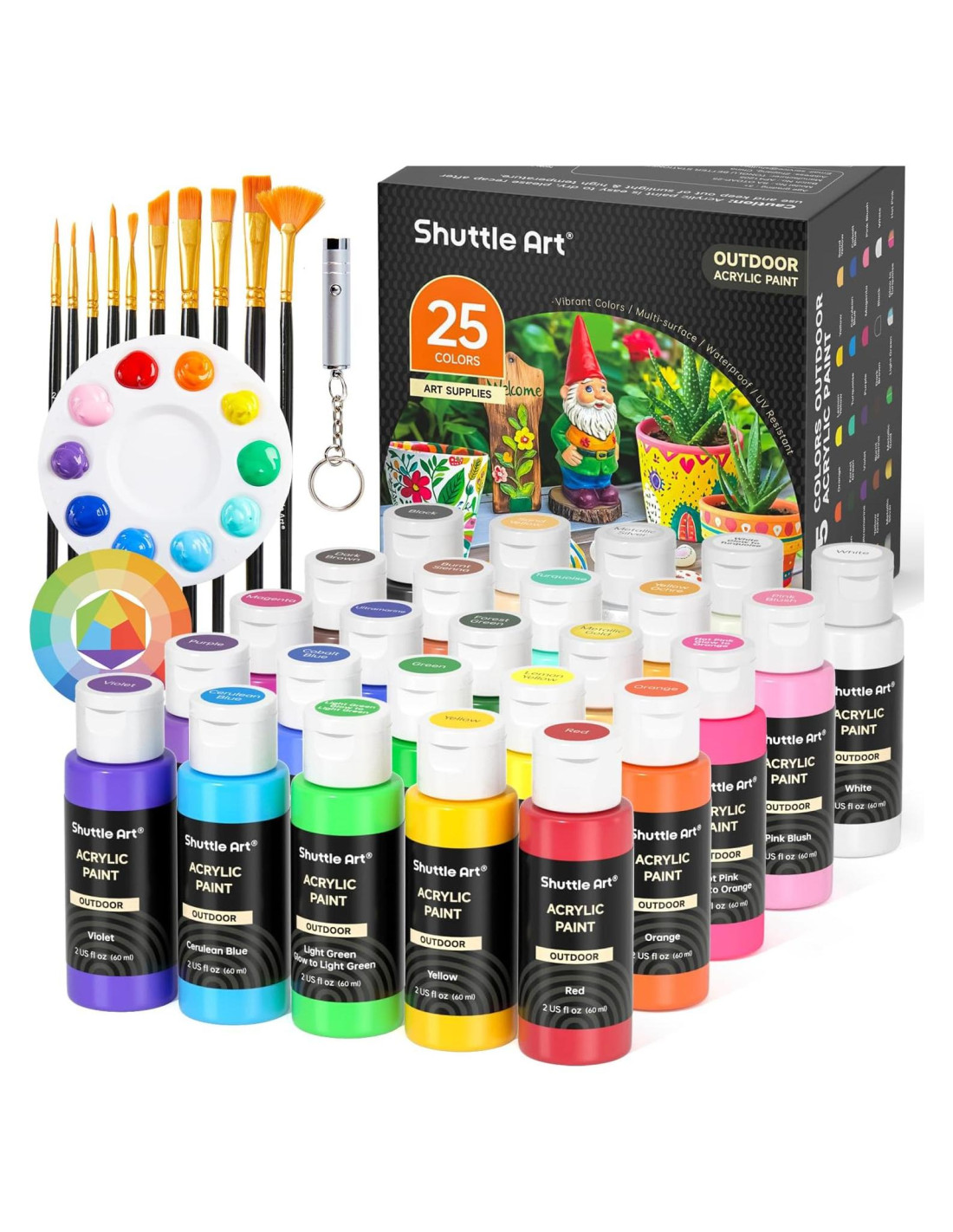 - 25 COLORES VIBRANTES: El conjunto de pintura acrílica exterior Shuttle Art incluye 25 pinturas acrílicas exteriores de alta calidad: 20 colores clásicos, 3 tonos que brillan en la oscuridad y 2 acabados metálicos, cada uno en botellas de 60 ml (2 oz). También incluye 10 pinceles, una paleta de mezcla, una mini luz UV, una rueda de colores y una guía de instrucciones, proporcionando todo lo que necesitas para infinitas posibilidades creativas