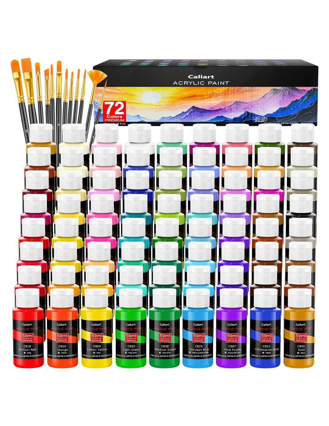 Juego de Pintura Acrílica Caliart con 12 Pinceles, 72 Colores (59ml, 2oz) Regalos de Pintura para Artistas Adultos Principiantes Pintores, Kit de Pintura de Calabaza de Halloween en Lienzo Cerámica Piedra