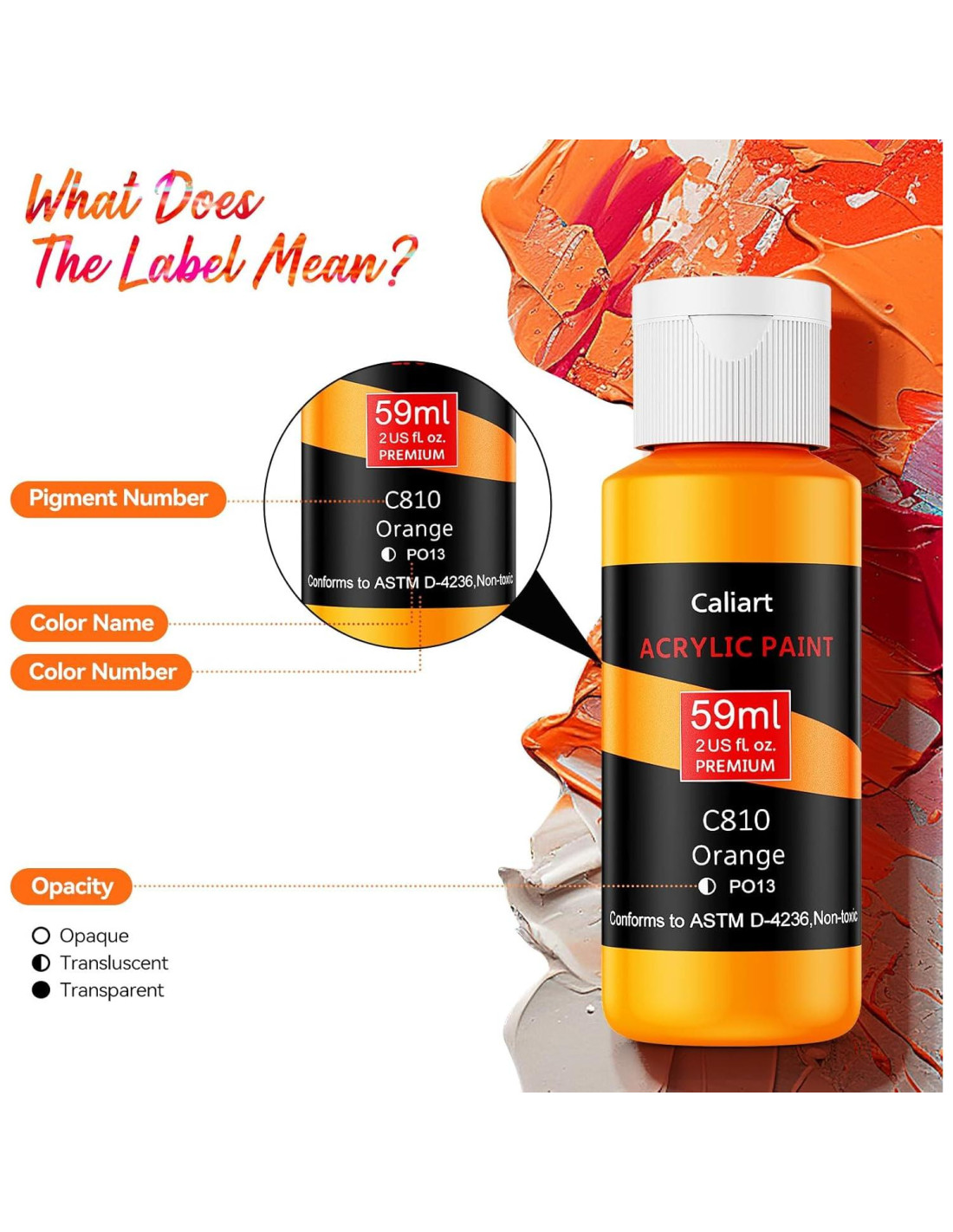 - Suministros de Arte y Manualidades Premium. Las pinturas acrílicas Caliart son versátiles en arte en lienzo, pintura, álbumes de recortes, decoraciones de Navidad, Halloween y más. Adecuadas para la mayoría de las superficies, incluyendo lienzo, madera, piedras, pintura de calabazas, lienzo estirado, telas, piedra, metal, plástico, cerámica, pared decorativa, pizarra, papel, yeso. Gran regalo para adultos creativos, artistas, principiantes. Empacado en una caja resistente para mantener siempre organizado y accesible.