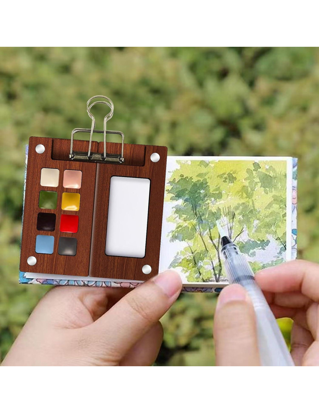 - Regalo Perfecto para Amantes del Arte: Este mini set de paleta de acuarela portátil viene con 1 mini paleta de pintura de 8 colores, 1 libro de bocetos de acuarela, 1 clip de metal, 1 pluma de pincel de acuarela, 1 bolsa de almacenamiento, kit completo diseñado para entusiastas del arte, fácil de llevar. Crea impresionantes pinturas de acuarela en cualquier lugar, en cualquier momento