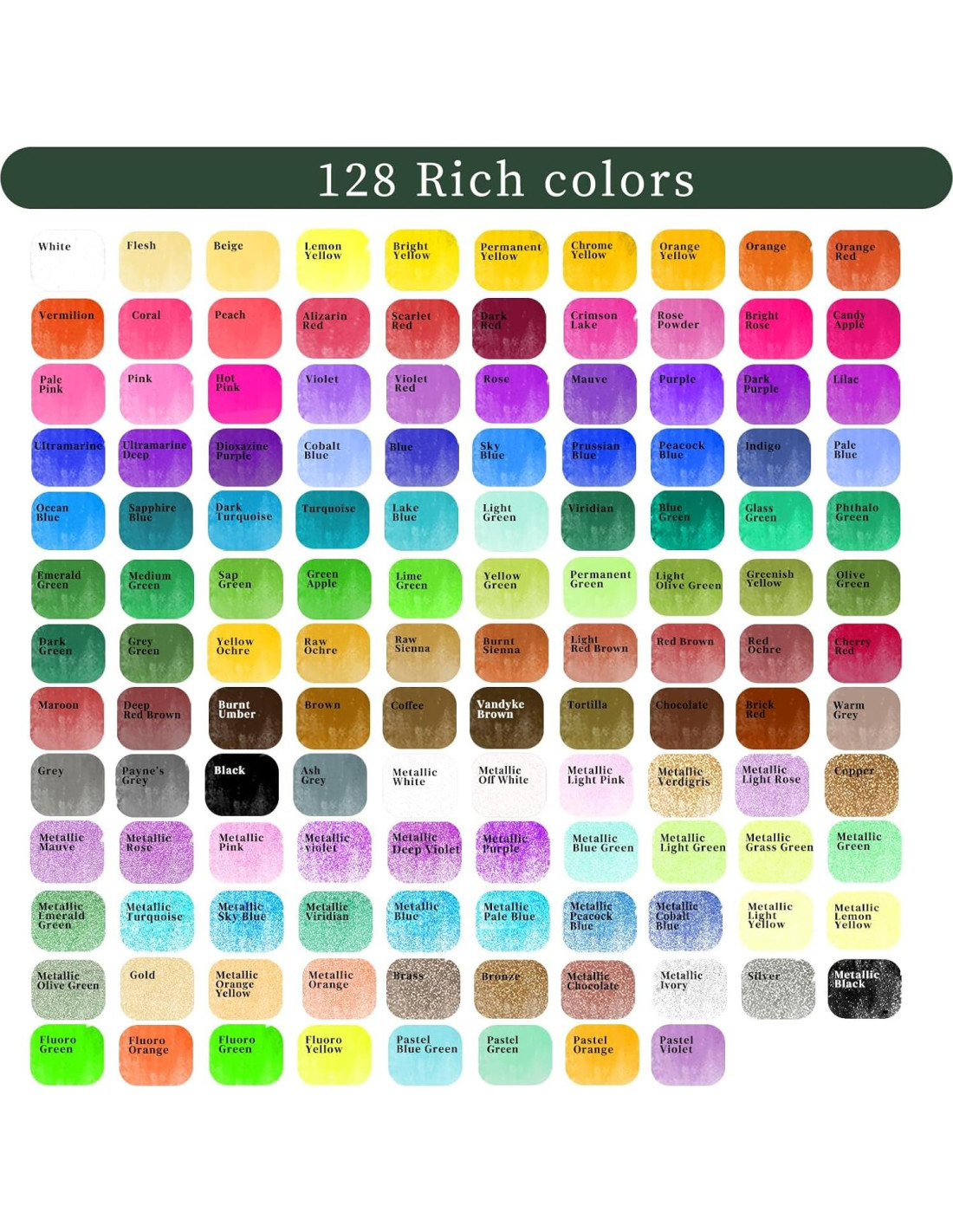 - JUEGO DE ACUARELA COMPLETO: Este kit de acuarela viene con 128 colores únicos, incluye 84 colores regulares, 4 colores fluorescentes, 36 colores metálicos, 4 colores pastel. Además de 128 colores únicos, este set de acuarela también incluye 1 pluma de pincel de agua, 1 pincel de nailon, 1 sacapuntas, 1 lápiz de boceto, 1 carta de colores, 10 papeles de acuarela, 1 esponja natural, 1 caja de metal portátil y 1 bolsa de terciopelo. Todo en este set de acuarela, perfecto para artistas de todos los niveles