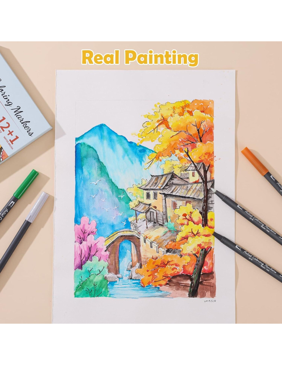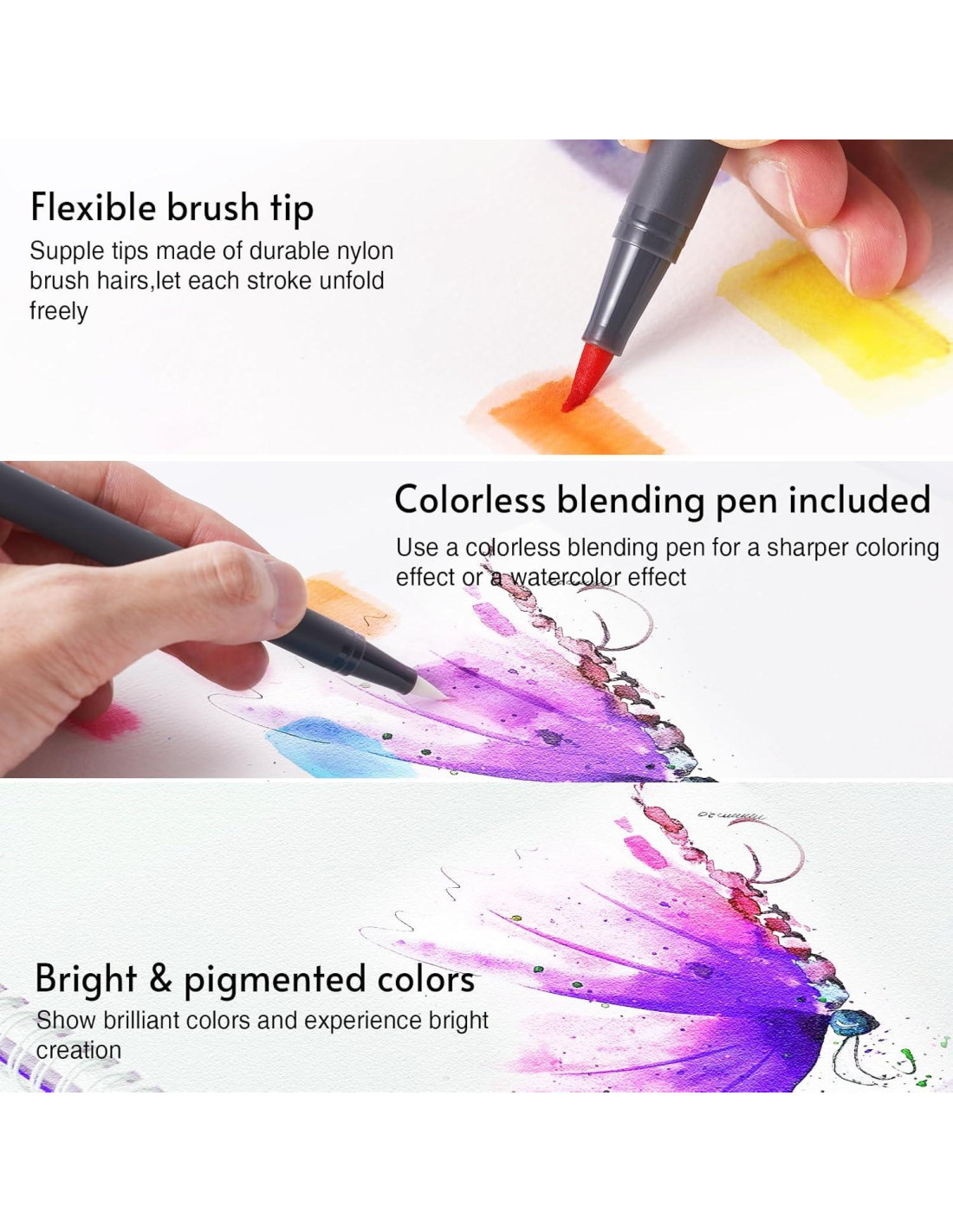 - [ Punta de Pincel Flexible y Autolimpiante ] - Los Pinceles de Acuarela con punta de pincel flexible, están hechos de fibras de nylon suaves y resistentes, la punta fina es fuerte y firme, haciéndolos lo suficientemente duraderos para soportar presión y mantener la resiliencia incluso después de un uso extenso. Tanto la punta de pincel como la punta fina de los Pinceles de Doble Punta son fáciles de limpiar al garabatear en un trozo de papel de desecho, manteniendo los colores puros y precisos.