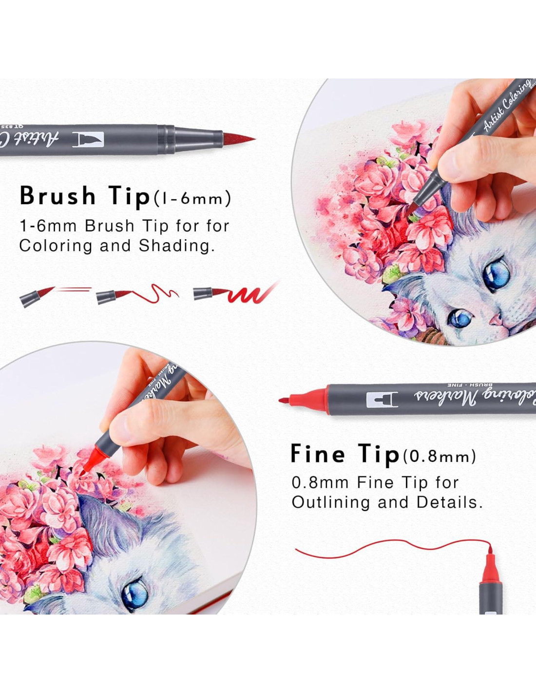 - [ Marcadores de Arte de Doble Punta y Fino ] - Cada marcador de punta de pincel tiene un diseño de doble extremo, proporcionando gran versatilidad. Estos marcadores de color están ingeniosamente diseñados con una punta precisa de 0.8mm para arte detallado y una punta de pincel versátil que se ajusta de 1 a 6mm, perfecta para todo, desde ilustraciones meticulosas hasta caligrafía audaz. Puedes elegir la punta fina para barridos, detalles, trazos caligráficos o la punta de pincel amplia para colorear rápidamente grandes áreas.
