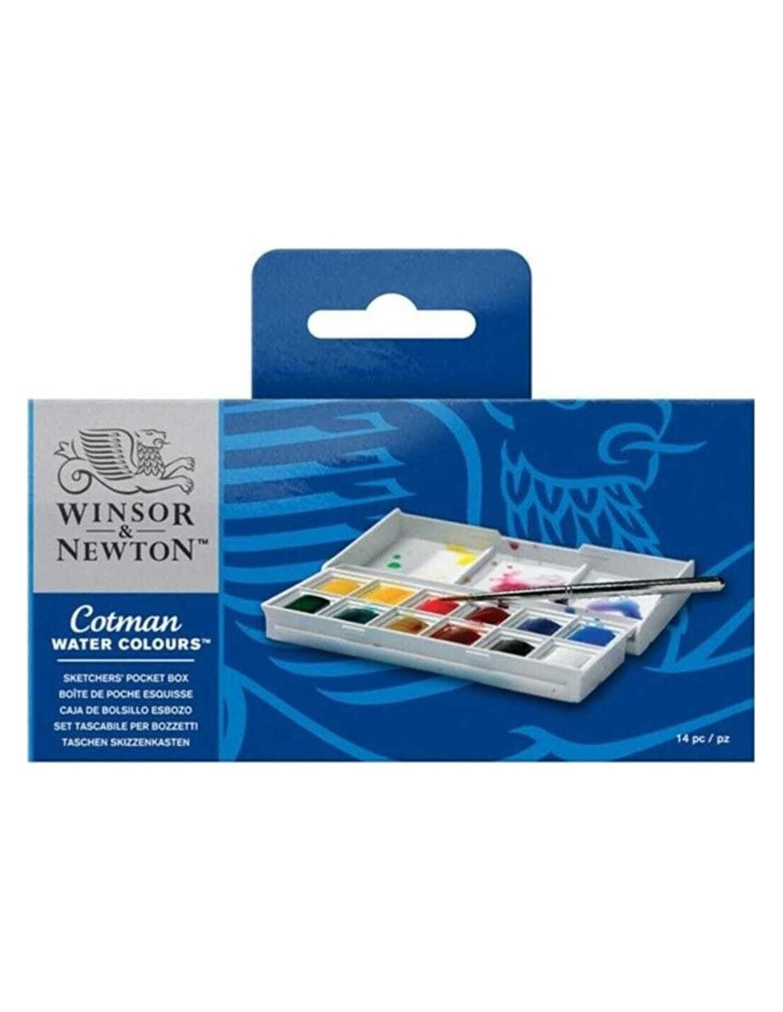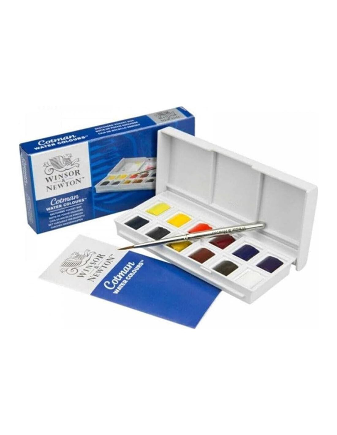 Esto es para 1 pcs. Winsor & Newton Cotman Acuarela Caja de Bocetos de Bolsillo- Unidad: set de 12. Convenientemente del tamaño de un bolsillo, este set de acuarelas contiene 12 medios pastillas de Acuarelas Cotman y un pincel de bolsillo colapsable Sceptre Gold. Viene en una caja de plástico ligera y resistente que cuenta con una paleta de mezcla en la tapa. Este set incluye los colores Amarillo Limón, Amarillo Cadmio, Rojo Cadmio Claro, Carmín Alizarina, Ultramarino, Azul Intenso (Ftalocianina), Verde Viridián, Verde Sap, Ocre Amarillo, Siena Tostada, Umber Tostado y Blanco Chino.
