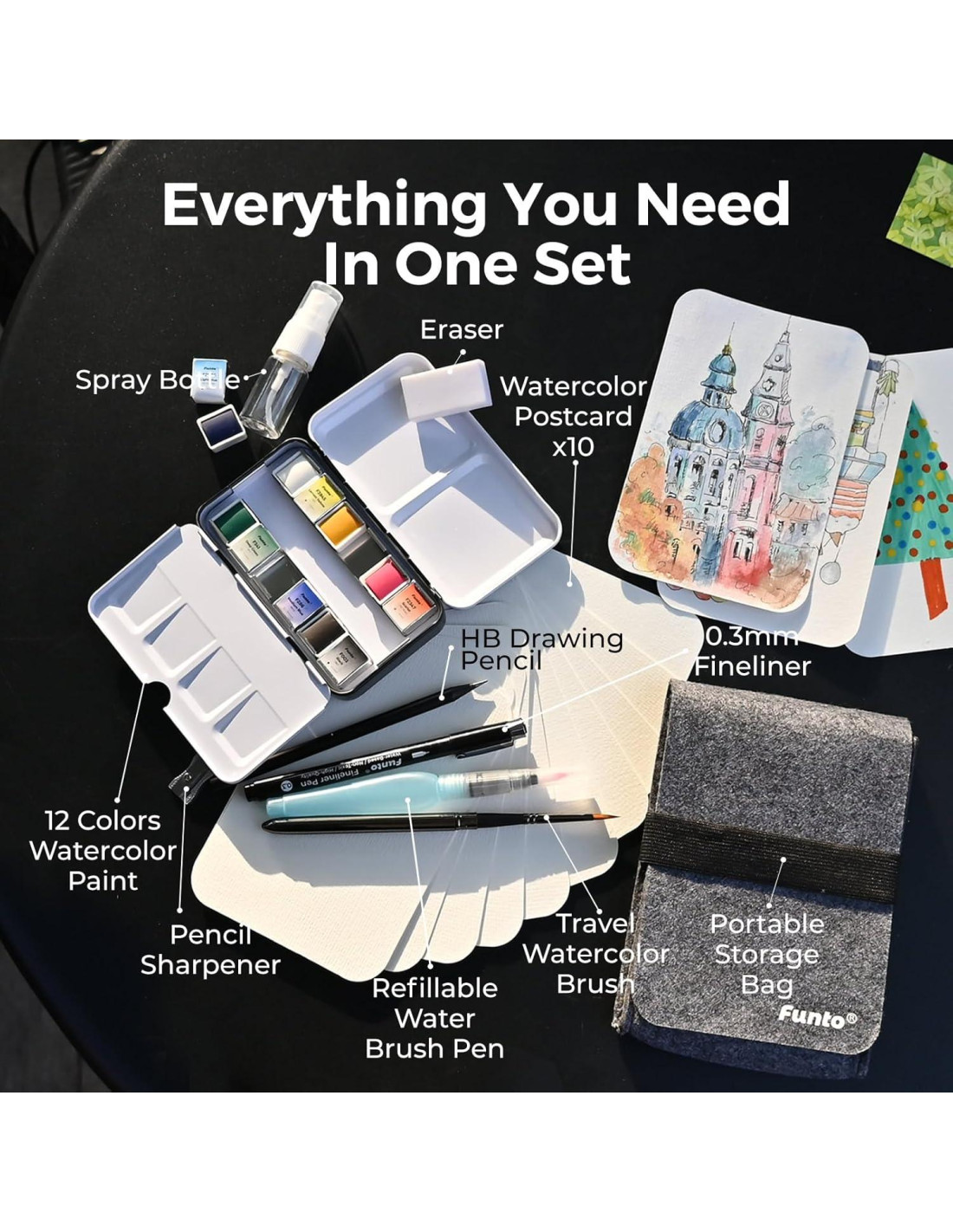 - SET DE PINTURA ACUARELA DE VIAJE - Viene con pintura de 12 colores en un estuche de metal. 10 postales de acuarela de alta calidad, pinceles, pluma de pincel, fineliner de 0.3mm, lápiz y una botella de spray. Todo viene en una bolsa de almacenamiento, lo que lo hace perfecto para pintar sobre la marcha.