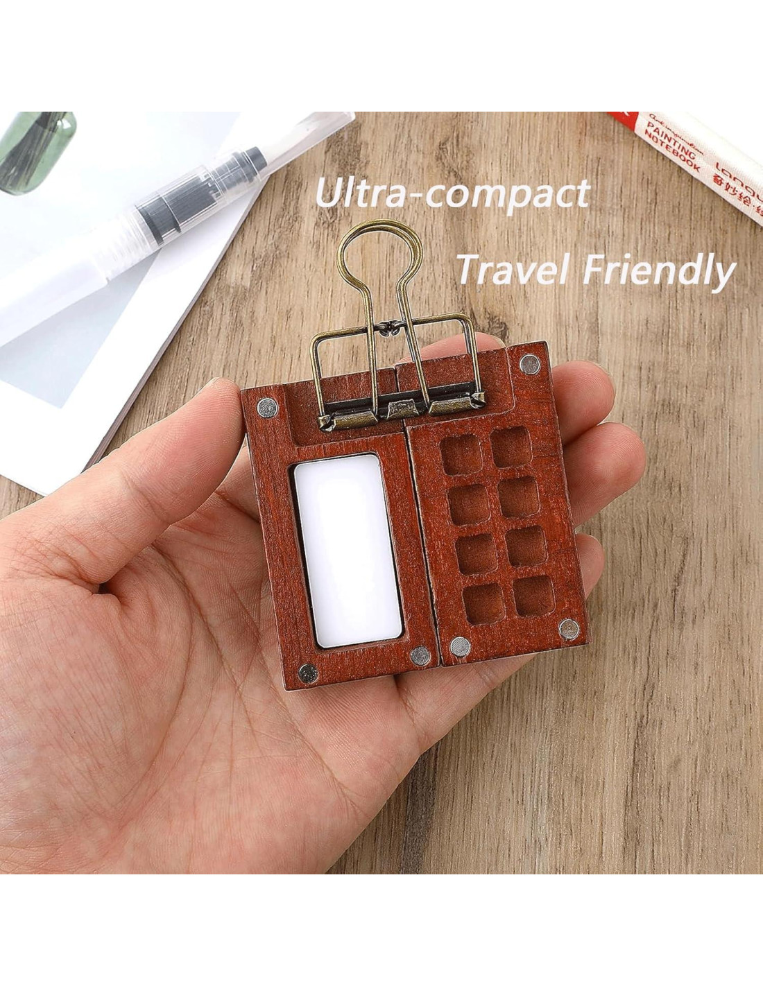 - [JUEGO DE PALETA DE ACUARELA PORTÁTIL MINI] Todo lo que necesitas está en movimiento, este mini juego de pintura acuarela incluye una paleta de madera de nogal (8 rejillas), 12 pinturas vibrantes, 2 libretas de bocetos, plumas de pincel y un clip de metal. Perfecto para bocetos al aire libre, inspiración de viaje o sesiones de arte espontáneas