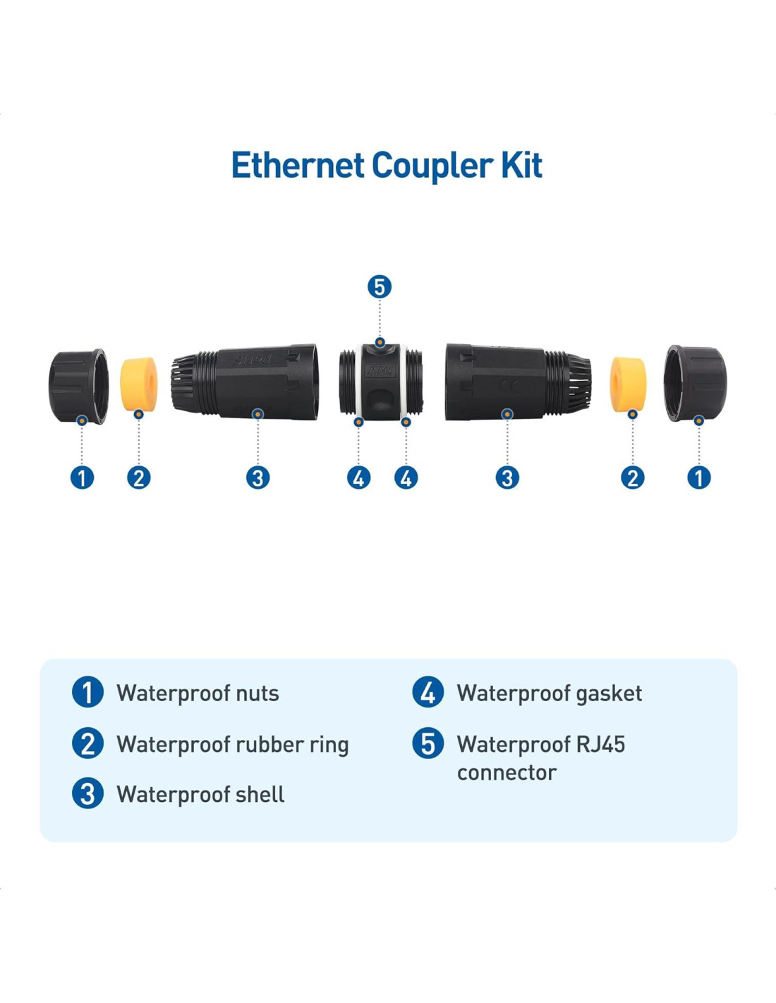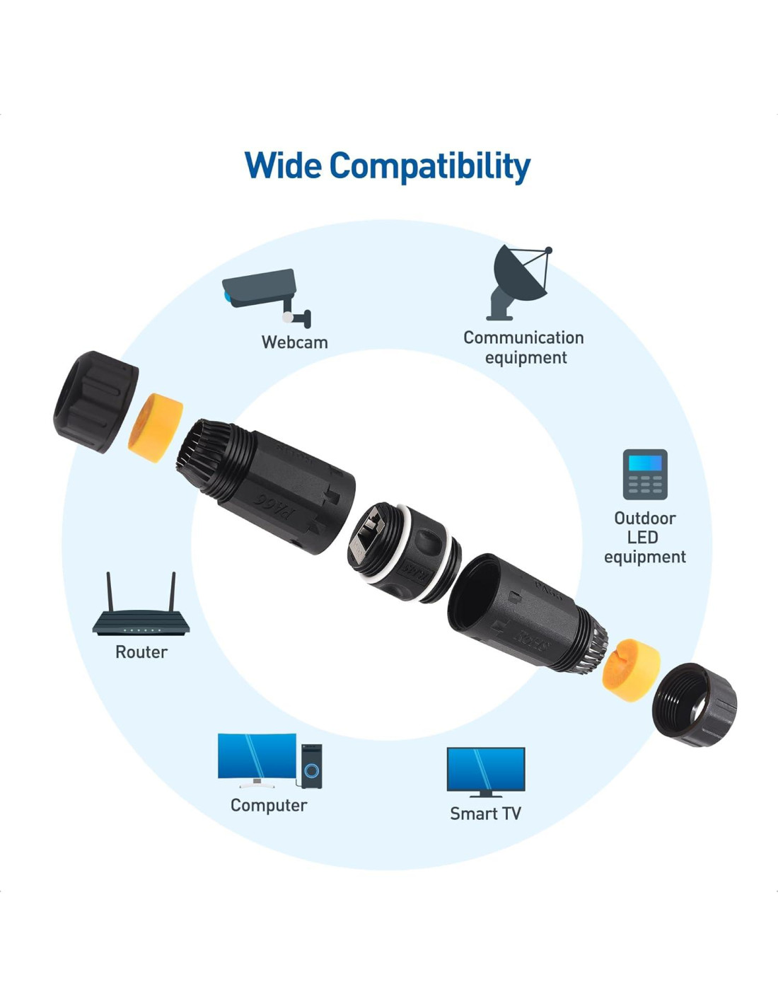 - Fácil de Instalar: La instalación simple del acoplador Ethernet impermeable te permite convertir instantáneamente un acoplamiento de cable Ethernet en una solución impermeable para exteriores; Simplemente pasa cada lado del cable a través de la tuerca, anillo y carcasa impermeables incluidos, conecta cada extremo al conector RJ45 y asegúralo con los anillos de goma y la tapa