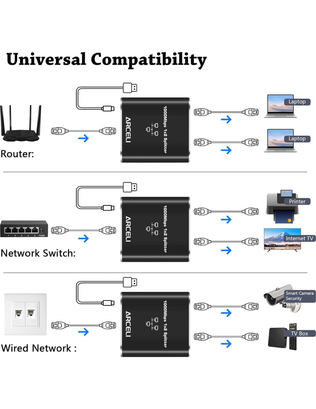 - Compatibilidad Universal: Ya sea que estés utilizando cables Ethernet Cat 5, 5e, 6, 7 u 8, este divisor RJ45 1 a 2 puede manejarlo con facilidad. Su amplia compatibilidad es ideal para su uso en una variedad de entornos de red, como con ADSL, impresoras, conmutadores, televisores, decodificadores, enrutadores, computadoras y más.