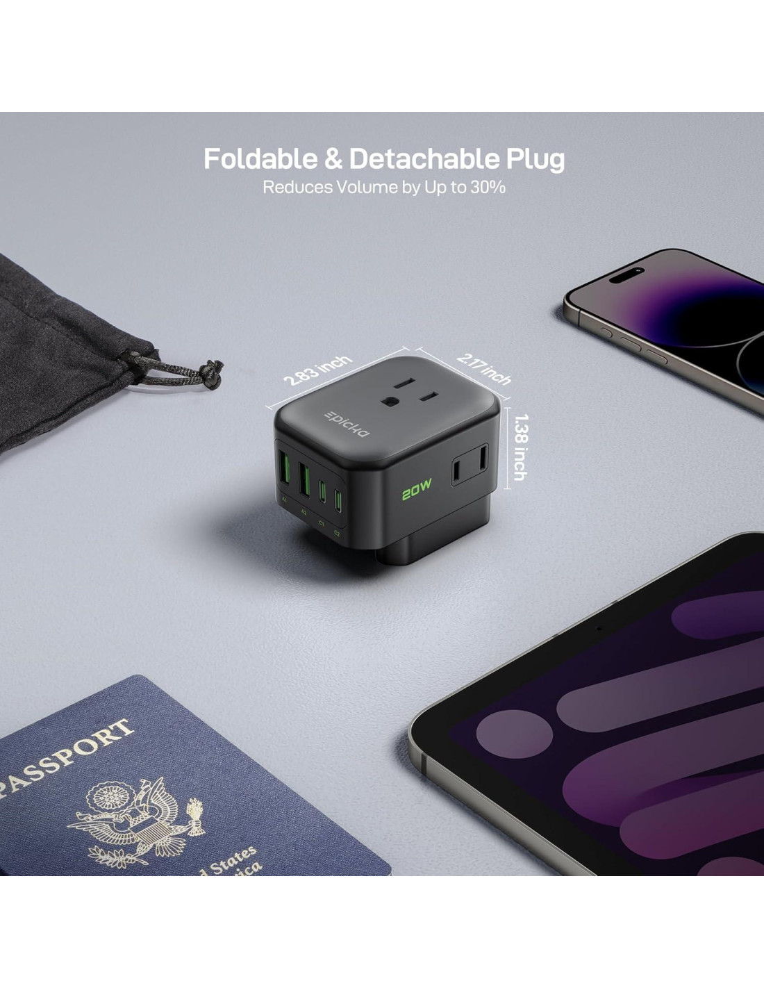 - Adaptador de Enchufe de Viaje Europeo 8-en-1: Este adaptador de viaje europeo cuenta con 8 salidas: 4 enchufes de CA y 4 puertos de carga rápida USB (incluyendo 2 USB-C). Ofrece más puertos en un tamaño más pequeño, midiendo solo 7.19 x 5.51 x 3.51 centímetros. Las patas plegables facilitan el empaquetado y son perfectas para viajar, mientras que el diseño cuidadosamente pensado de la disposición de las salidas asegura que los enchufes de CA de cara frontal nunca bloqueen los puertos USB, maximizando la eficiencia de carga en espacios reducidos.