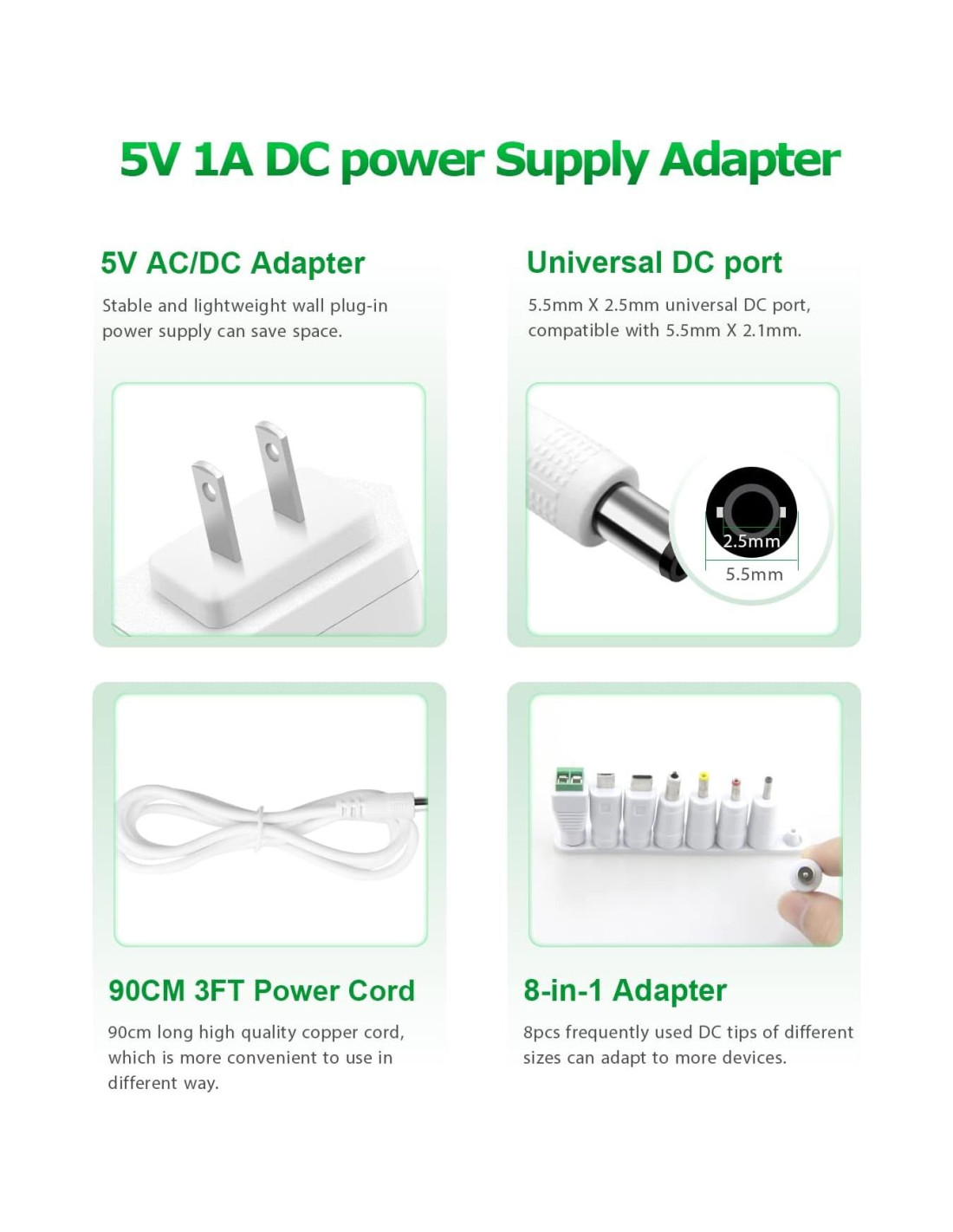 - El paquete incluye: 1 x adaptador ac/dc 5V 1A, 8 x puntas DC. Sistemas de protección de seguridad múltiples integrados y seguro de usar. Si tiene alguna pregunta sobre el producto, no dude en consultarnos antes de devolverlo. ¡Siempre apoyamos y proporcionamos un excelente soporte postventa!