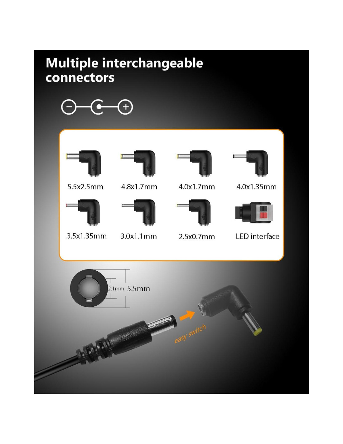 - [Tamaño del enchufe DC] Tamaño del conector de salida de barril DC original: 5.5mm (diámetro exterior) x 2.1mm (diámetro interior) x 12mm (longitud); Polaridad: Positivo interior (+), Negativo exterior (-); Tipo: Macho; Para mejorar la compatibilidad de varios dispositivos, viene con 8 enchufes adaptadores seleccionables: 5.5x2.5mm, 4.8x1.7mm, 4.0x1.7mm, 4.0x1.35mm, 3.5x1.35mm, 3.0x1.1mm, 2.5x0.7mm; interfaz LED (conector DIY).