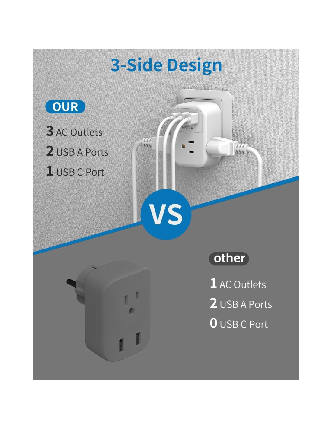 - 6 en 1 adaptador de enchufe de viaje europeo con USB - El adaptador de enchufe europeo proporciona 3 salidas estándar americanas, capacidad máxima de hasta 2500 vatios (máx. 250 voltios, 10 A); 3 puertos USB pueden cargar hasta 3.1A, permitiéndote cargar 5 dispositivos simultáneamente como teléfono celular, tableta, banco de energía y otros cargadores eléctricos. No es necesario llevar adaptadores adicionales en tu viaje.