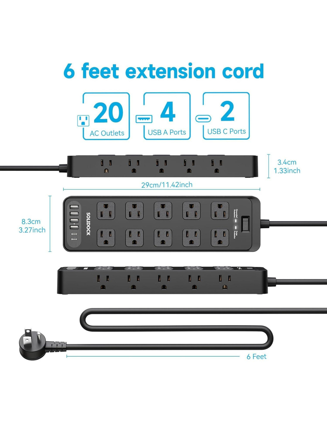 - [26 en 1 Regleta] - La regleta con 20 salidas de CA y 6 puertos de carga USB, cable de extensión de 6 pies (1.83 m) de alta resistencia (1875W/15A), diseño de voltaje de 2700 julios de amplio rango, se puede usar en circuitos de 120V a 240V.