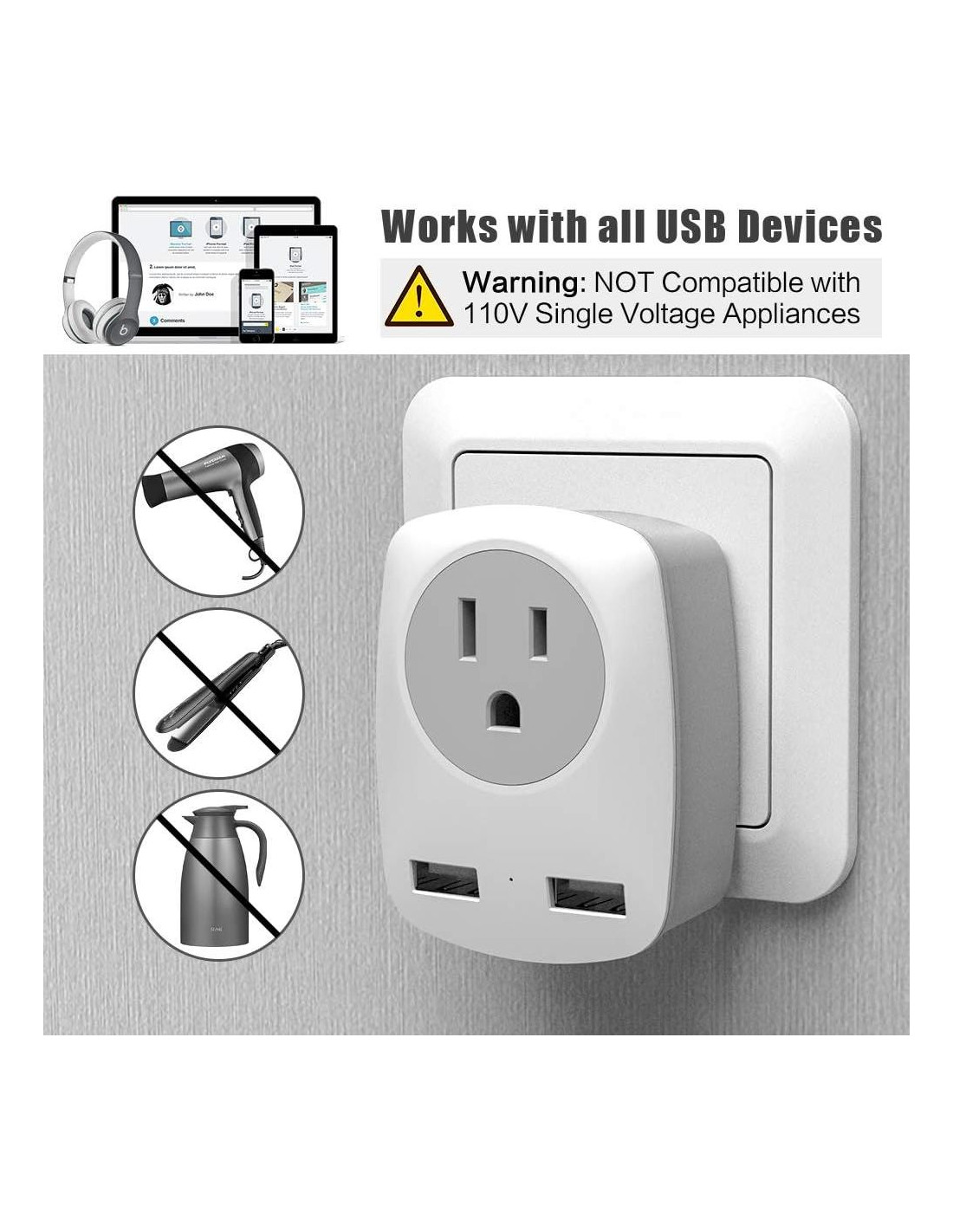 - 2 USB y 1 Enchufe de CA - El adaptador de enchufe europeo JARVANIA (3 clavijas a tierra seguras) proporciona un enchufe de CA estándar de América del Norte (2 o 3 clavijas) que te permite cargar cualquier electrodoméstico de doble voltaje (120-240V) como la laptop, vaporizador de ropa, afeitadora (Máx 250V / 10A). Los puertos de carga USB duales pueden cargar tu teléfono celular/tableta/cámara/batería portátil/auriculares inalámbricos, etc. simultáneamente hasta 2.4A.