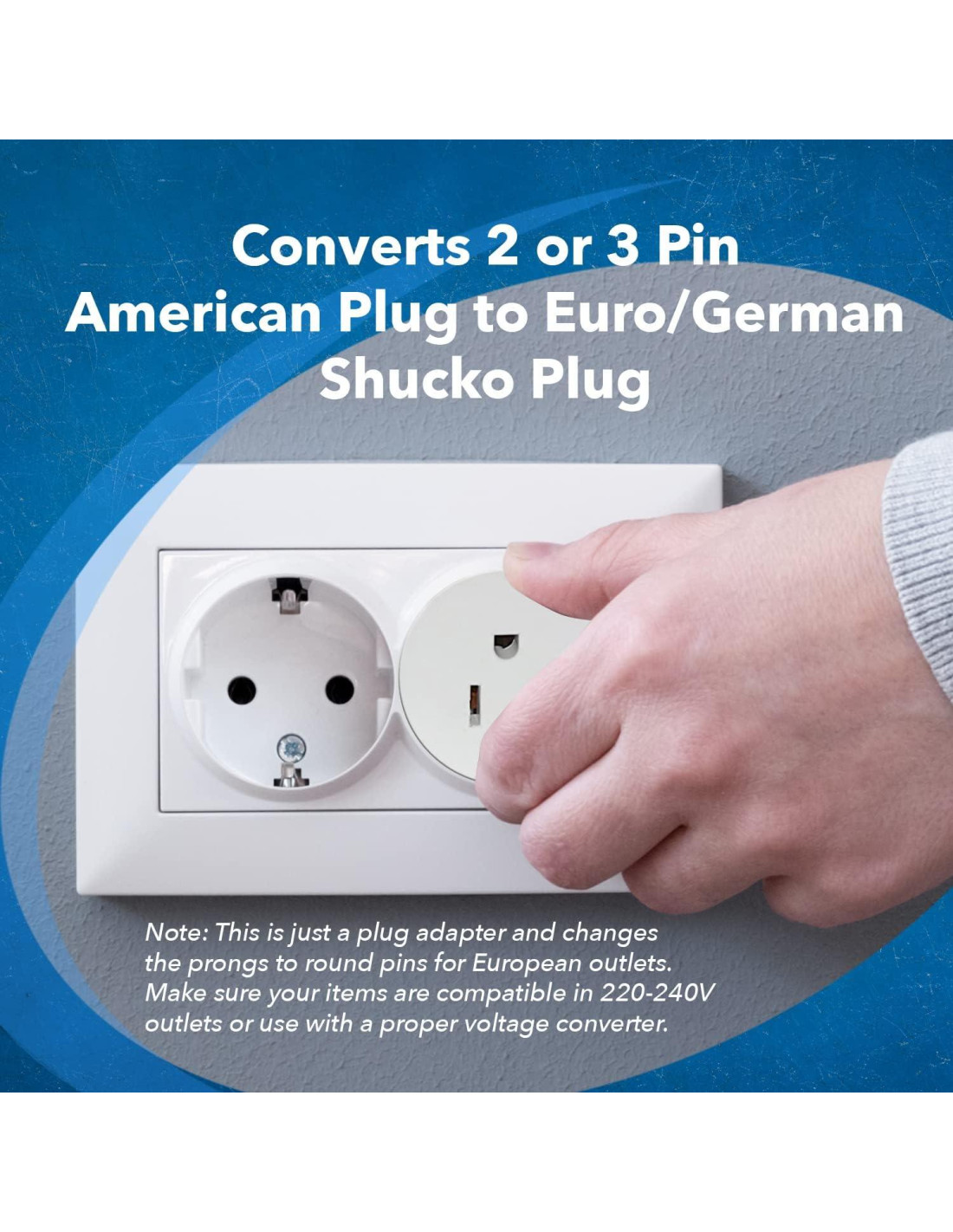 - Nota: Este es solo un adaptador de enchufe, y solo cambia los pines a pines redondos para tomas de corriente europeas. Asegúrate de que tus artículos sean compatibles para su uso en tomas de 220-240V o usa un convertidor de voltaje adecuado.