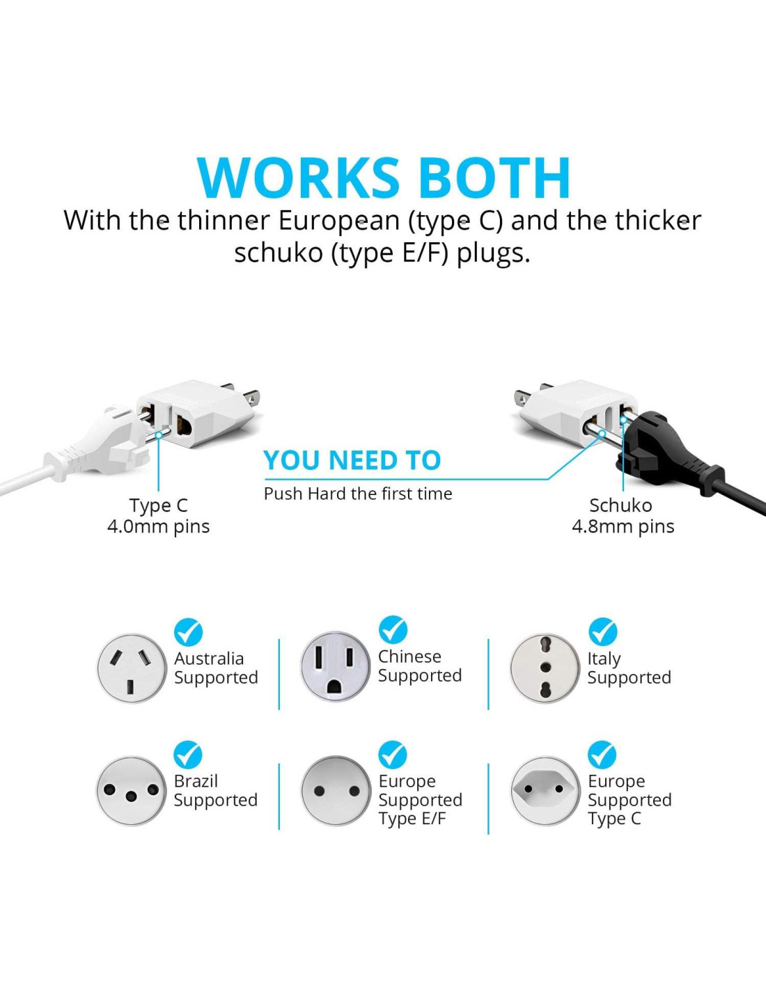 - * ADAPTADOR DE ENCHUFE DE VIAJE DE EE. UU. KOMBO diseñado especialmente para viajeros americanos. Estos te permiten enchufar instantáneamente para cargar tu teléfono inteligente, laptop, secador de pelo, plancha, afeitadora, altavoz bluetooth, tableta u otros dispositivos en hoteles, aeropuertos y oficinas en todo el mundo. Estos adaptadores son la conveniencia confiable que necesitas para disfrutar plenamente de tus viajes sin problemas de adaptabilidad molestos.