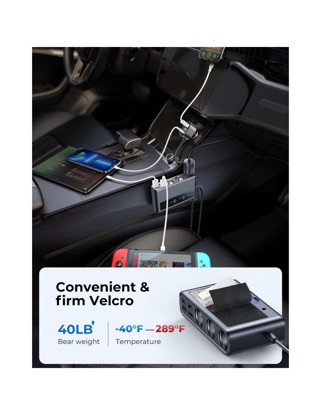 - [Interruptor de Energía Independiente] Hemos mejorado el interruptor independiente para cada divisor de encendedor de cigarrillos, no solo para ampliar la vida útil del Adaptador de Cargador de Coche USB C de manera efectiva, sino también para evitar que tenga que enchufar y desenchufar repetidamente.