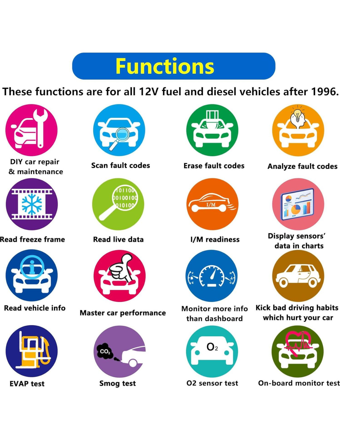 Esta herramienta es solo para vehículos de 12V después de 1996. No soporta motocicletas.