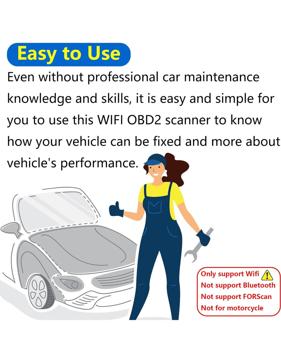 - Amplia compatibilidad con vehículos: esta herramienta de escaneo de diagnóstico adaptador OBD2 a WIFI OBD 2 ELM 327 soporta todos los vehículos de gasolina y diésel de 12V, pero no se puede usar para programar automóviles Ford Lincoln Mercury y Mazda. Este es un adaptador WiFi OBD2 ELM327, ¡PERO NO SOPORTA MOTOCICLETAS!