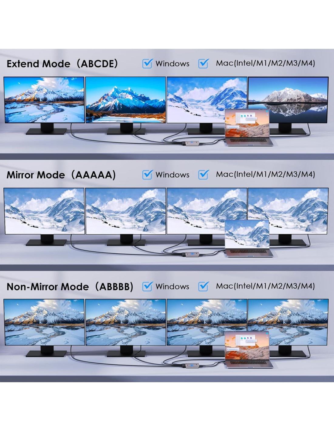 - Modos de Pantalla Flexibles: Cambia fácilmente entre modos de pantalla extendida y reflejada. Soporta configuraciones avanzadas como modo retrato para visualización vertical y modo con tapa cerrada para usar pantallas externas con la tapa de tu laptop cerrada-perfecto para personalizar tu espacio de trabajo