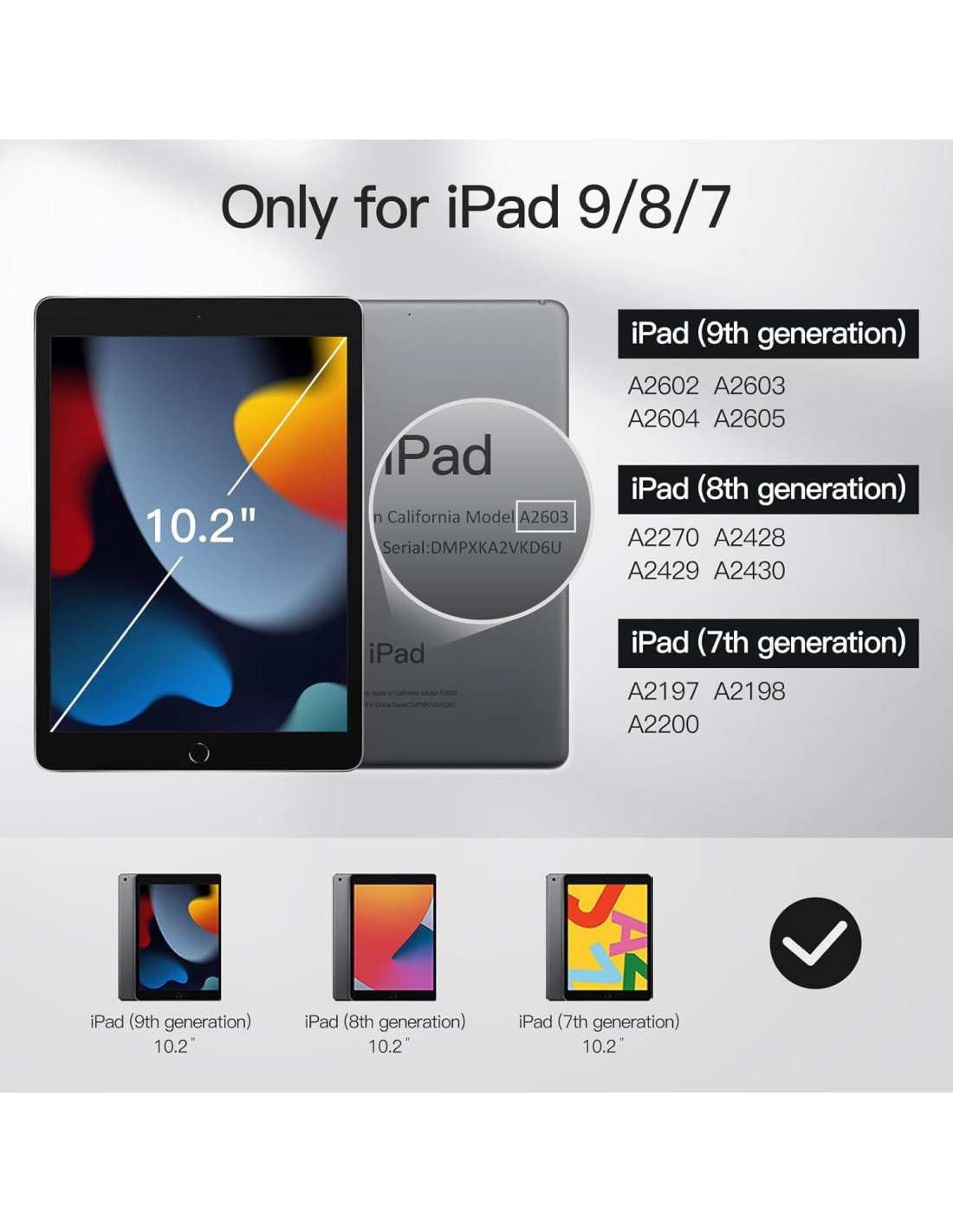 - Diseñada para iPad 9/8/7 (10.2 pulgadas, modelo 2021/2020/2019, generación 9/8/7). Modelos de iPad compatibles: A2602 / A2603 / A2604 / A2605 / A2428 / A2429 / A2430 / A2270 / A2197 / A2198 / A2200. NO compatible con iPad Air o iPad Pro o cualquier otro modelo de iPad. Por favor, verifica la parte trasera inferior para encontrar el modelo de iPad antes de comprar