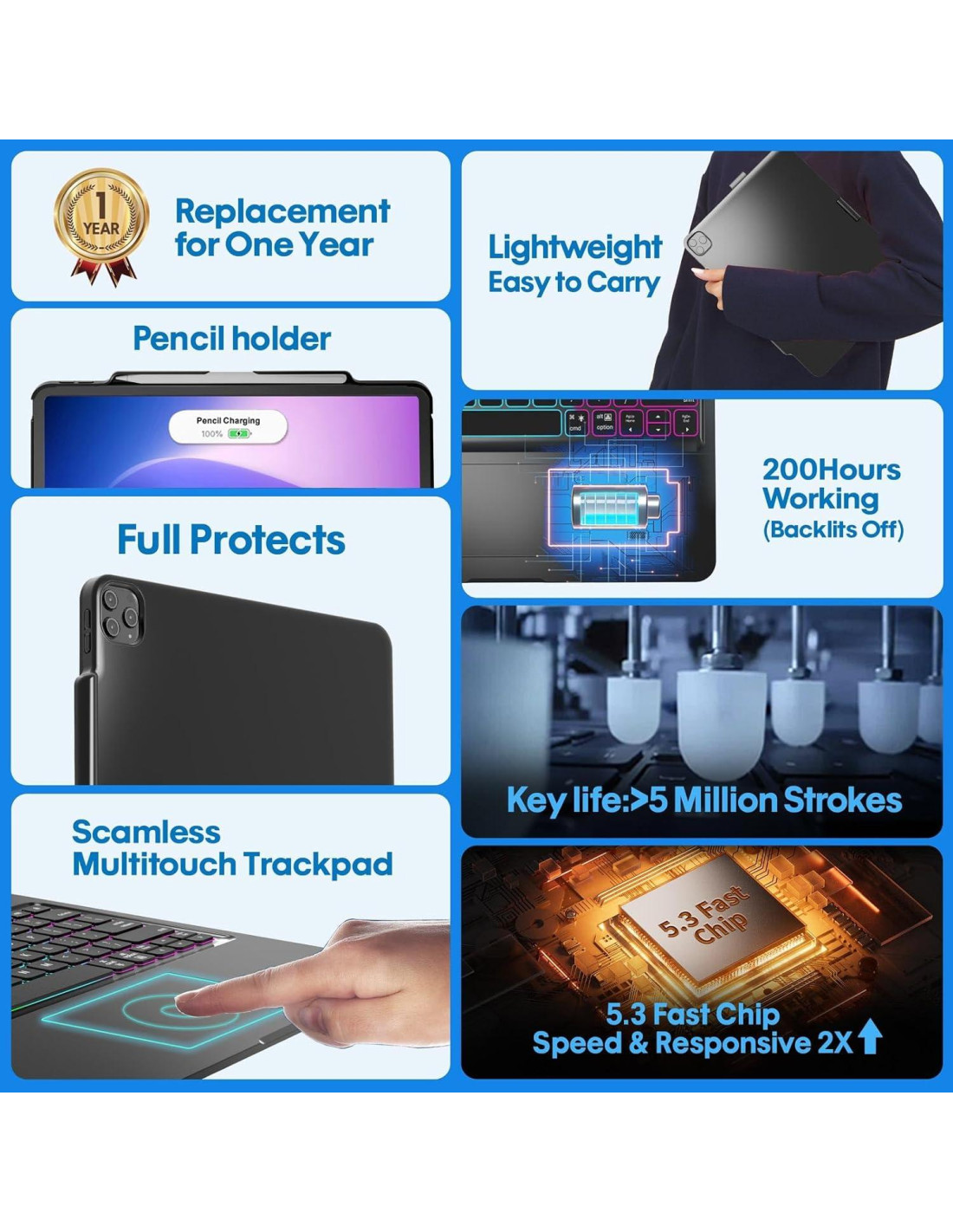 - Teclas retroiluminadas y batería recargable de larga duración - Funda de teclado para iPad Pro 13 pulgadas con retroiluminación asegura que no tengas problemas al escribir en un entorno con poca luz. El teclado se ilumina con diferentes colores y se puede ajustar más brillante o más tenue según sea necesario. La batería del teclado táctil para iPad te permite trabajar hasta 200 horas con la retroiluminación apagada y 3 horas con la retroiluminación encendida. Solo 2-3 horas para cargar completamente el teclado. Batería recargable de 500mAh dura mucho tiempo con una sola carga, asegurando que puedas trabajar sin interrupciones.