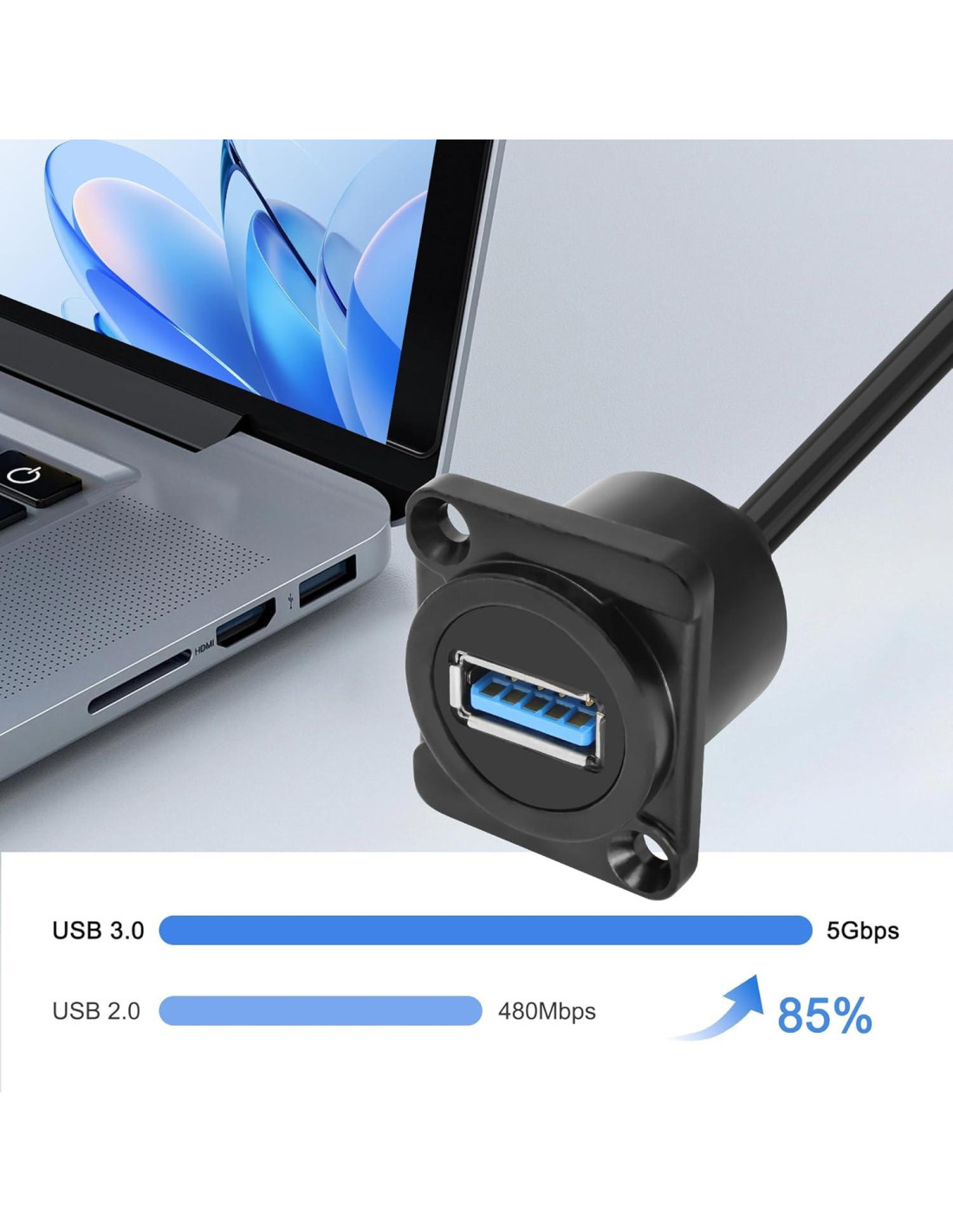- [Potencia de Carga] El cable de montaje en panel USB 3.0 a USB A proporciona una tasa de transferencia de hasta 5Gbps y una velocidad de carga de 5V/2A, soportando transmisión de audio y video 4K@60Hz, capaz de ser compatible hacia atrás con dispositivos estándar USB 2.0, 1.1 y 1.0
