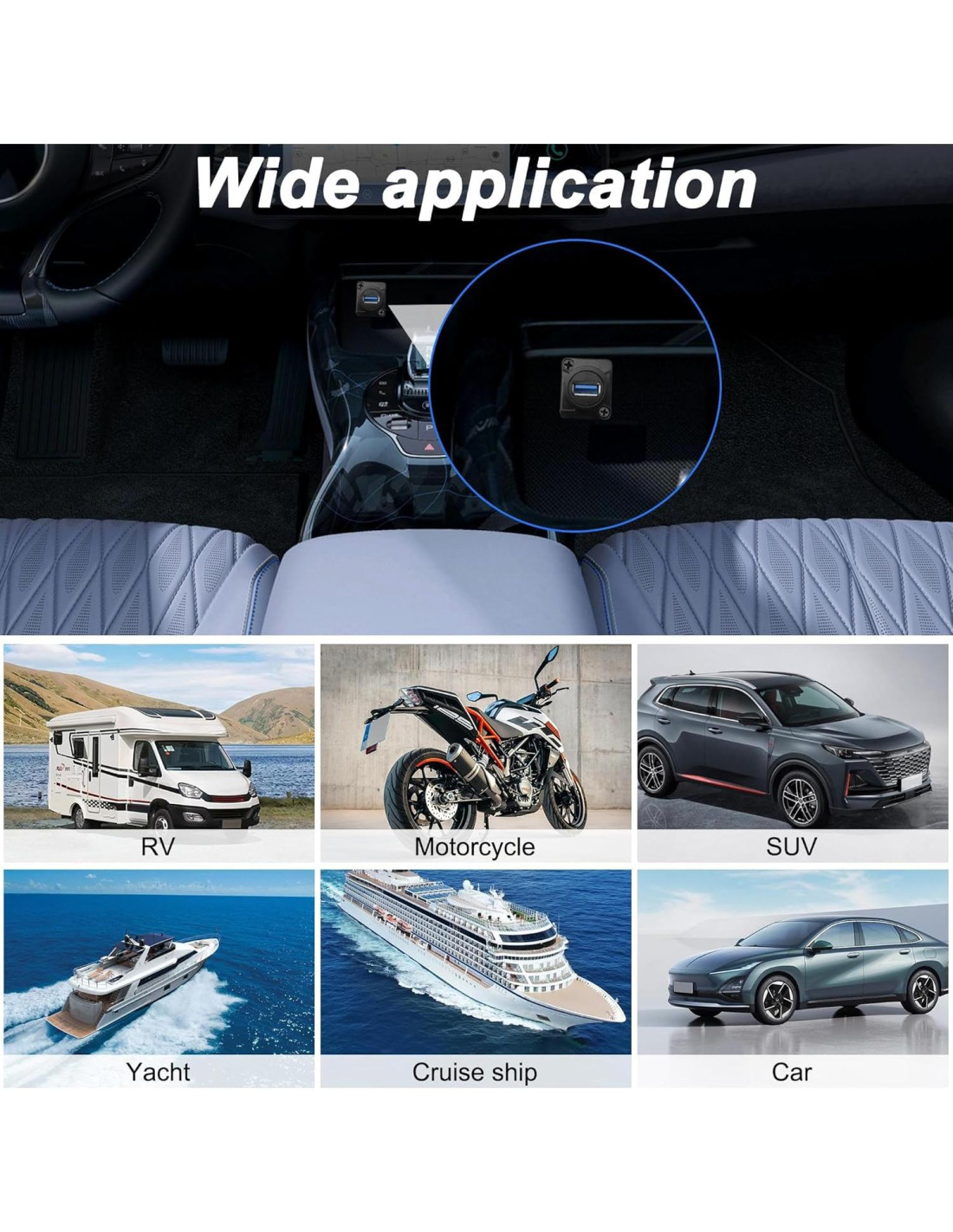 - [Aplicación] El cable adaptador de montaje en panel de paso USB A a USB A se utiliza para paneles de instrumentos en oficinas, hogares inteligentes, motocicletas, barcos, yates, etc.; También se puede instalar en gabinetes de equipos, paneles de equipos, paredes, computadoras de escritorio y enchufes de suelo