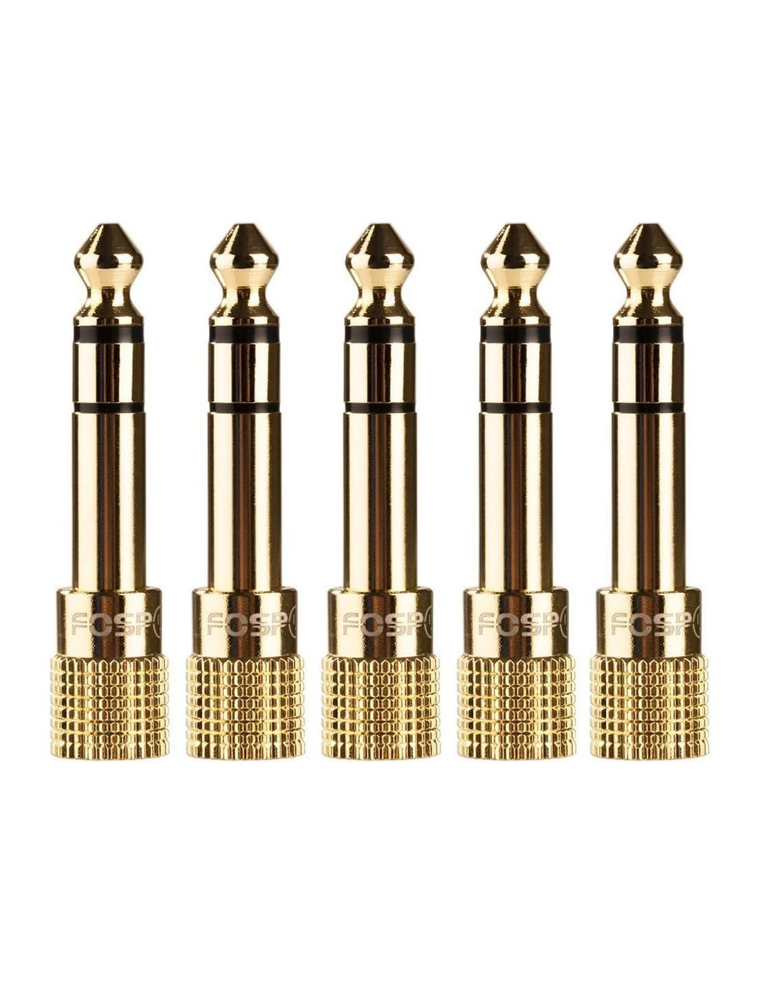 Este adaptador de auriculares estéreo premium te permitirá conectar tu par de auriculares favorito y otros dispositivos estéreo con equipos de audio profesional y de audio en casa. Convertirá un conector hembra de 3.5mm (1/8 pulgada) en un conector macho de 6.35mm (1/4 pulgada). Permite conectar un conector macho de audio estéreo de 3.5mm (1/8 pulgada) en un conector hembra estéreo de 6.35mm (1/4 pulgada). Calidad de construcción: toda metálica, construcción de cobre bañado en oro de 24k para asegurar la mejor calidad de conexión de audio. Tipo de conector: macho TRS estéreo de 6.35mm a hembra TRS de 3.5mm. Diámetro del conector: macho de 6.35mm (conector) / hembra de 3.5mm (jack). Baño de oro para resistir la oxidación. Estéreo de entrada y salida. Roscas de agarre de 360 grados para facilitar la conexión y desconexión. Longitud: 4.5 cm. Peso: 8 g. El paquete incluye: adaptador de auriculares estéreo FosPower bañado en oro de 24k de macho de 6.35mm a hembra de 3.5mm (1/4 pulgada a 1/8 pulgada) x5. Construcción de cobre bañado en oro de 24k. Excelente sonido y calidad de construcción. Estéreo TRS de entrada y salida. Roscas de agarre de 360 grados. Estéreo macho TRS de 6.35mm a hembra TRS de 3.5mm (1/4 pulgada a 1/8 pulgada). Compatible con auriculares que tienen un conector macho TRS de 3.5mm (1/8 pulgada) y cualquier dispositivo de audio que use una conexión jack TRS estéreo de 6.35mm.