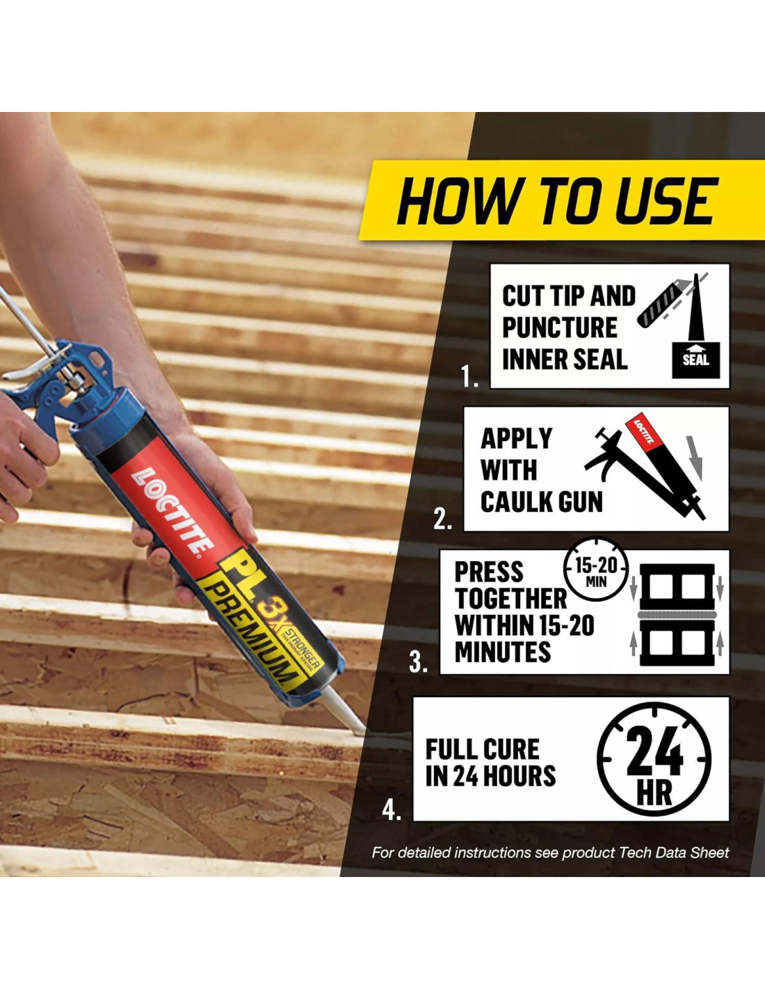 Loctite PL Premium Adhesivo de Construcción es un adhesivo de un componente, a base de poliuretano, que cura con humedad, perfecto para una amplia variedad de proyectos. PL Premium es 3 veces más fuerte que los adhesivos de construcción ordinarios. Este adhesivo de construcción pintable y resistente al agua es ideal para aplicaciones tanto exteriores como interiores, sin un fuerte olor a solvente, y se puede aplicar directamente sobre superficies húmedas y congeladas sin encogerse para proyectos exteriores. El Adhesivo de Construcción PL Premium une permanentemente casi cualquier sustrato y se fija en 30 minutos y cura completamente en 24 horas, incluso en temperaturas frías. Ideal para una variedad de proyectos, incluyendo instalaciones de subpiso, Loctite PL Premium se adhiere a la mayoría de los materiales de construcción comunes como madera, contrachapado, OSB, MDF, madera tratada, madera dura, pisos, concreto, piedra, granito, mármol, pizarra, mampostería, ladrillo, aislamiento de espuma de todo tipo, incluyendo EPS (espuma de poliestireno expandido), XPS (espuma de poliestireno extruido) y espuma de poliuretano, alfombras, metal, acero inoxidable, metal galvanizado, plomo, productos a base de cemento, paneles de cemento fibra, cerámica, fibra de vidrio, paneles de yeso, molduras de vinilo/PVC rígidas y celulares y molduras de poliash. Loctite PL Premium tiene bajo contenido de COV y cumple con estrictos requisitos regulatorios estatales y federales, así como con las especificaciones ASTM, HUD y APA AFG-01.