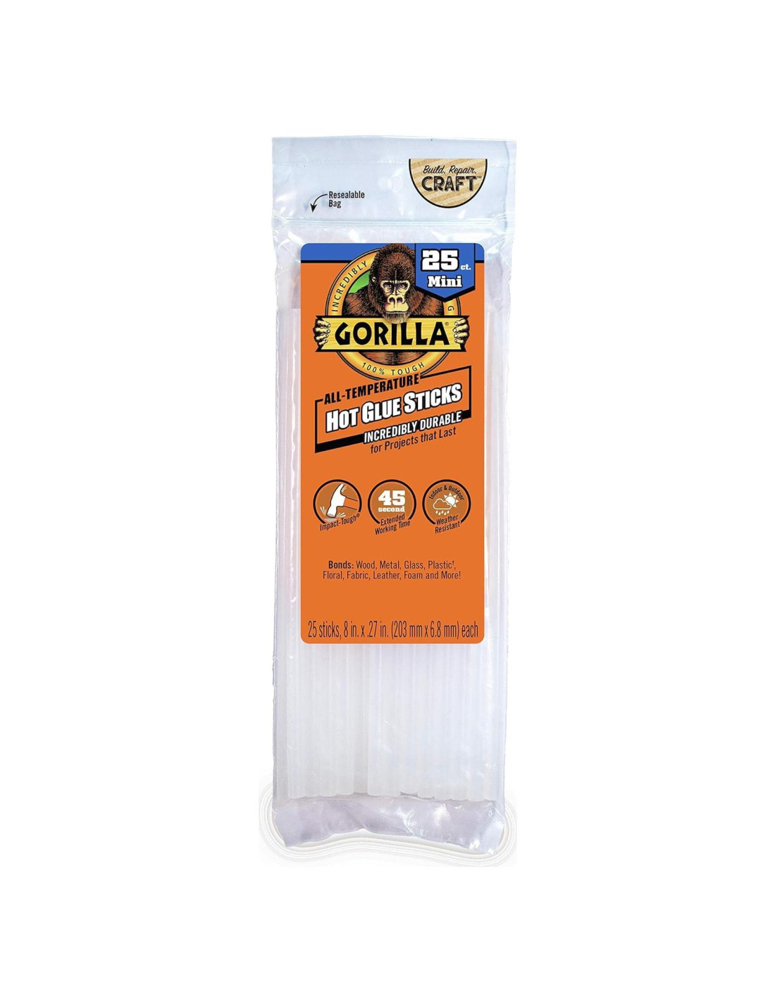 - Estas mini barritas de pegamento caliente de Gorilla son resistentes a la intemperie y duraderas ante impactos, lo que las hace increíblemente duraderas para que puedas crear proyectos que perduren. Hechas para funcionar con todas las temperaturas de las pistolas de pegamento, estas barritas proporcionan un fuerte agarre en muchas superficies, incluyendo madera, metal, vidrio, plástico y cuero.
