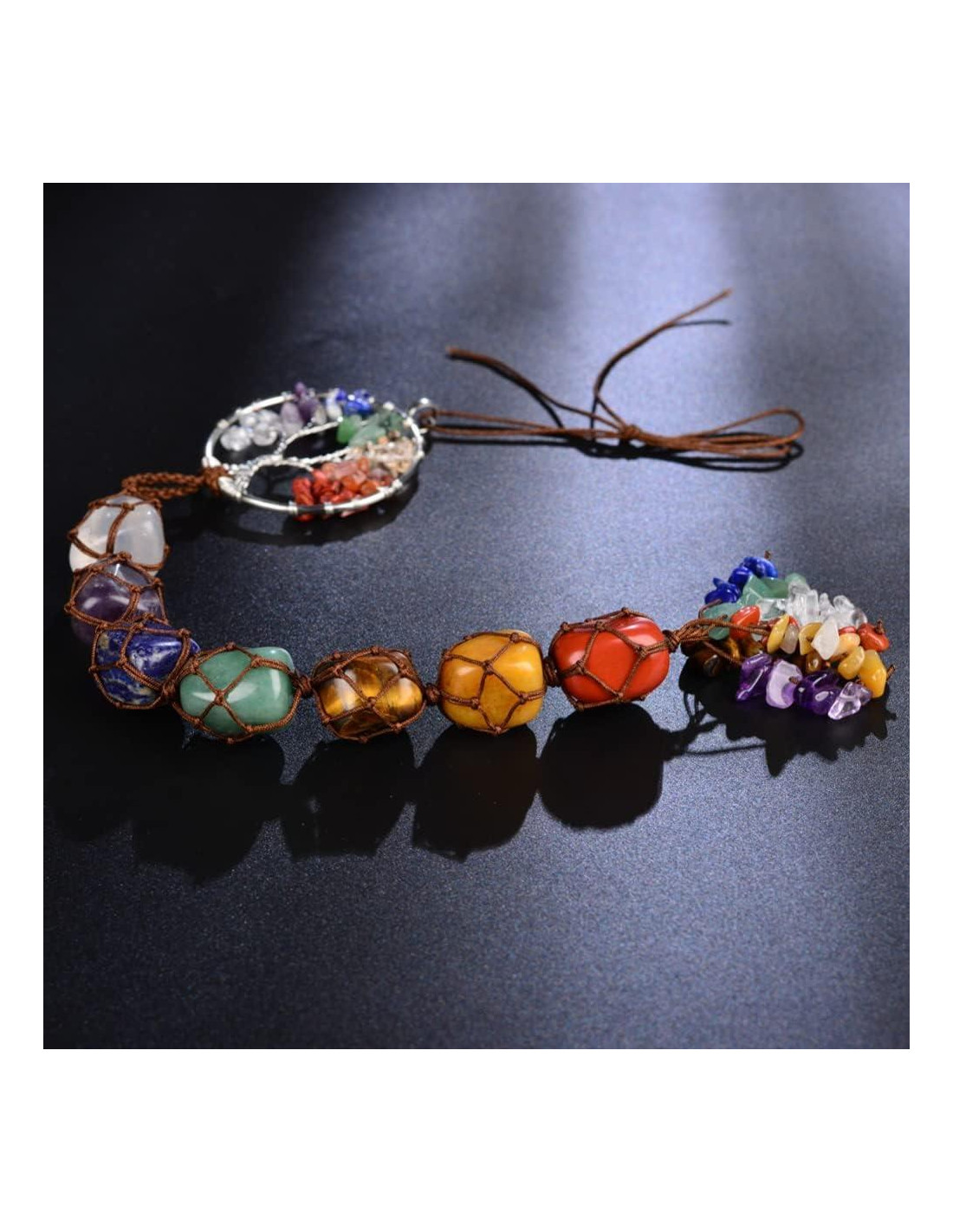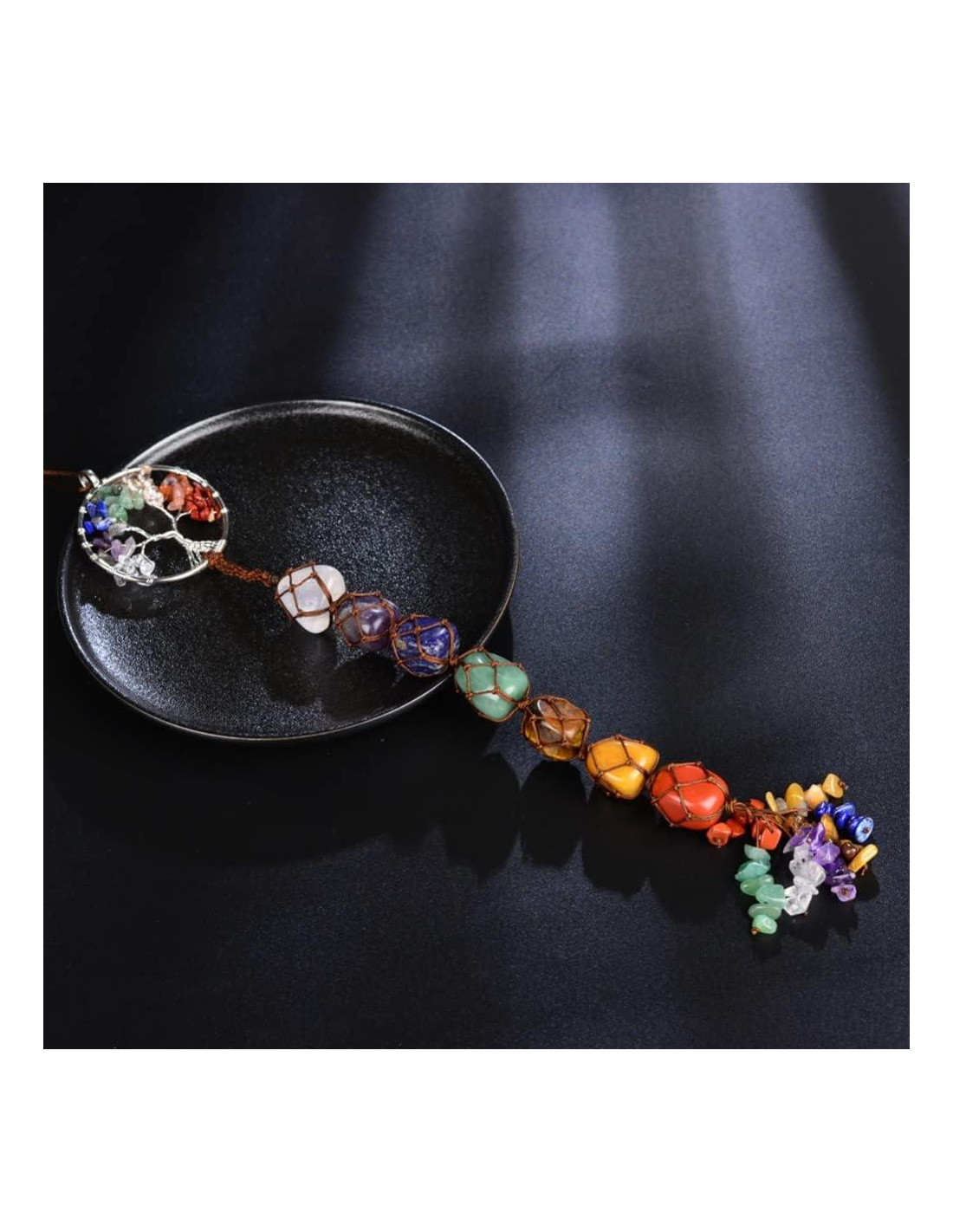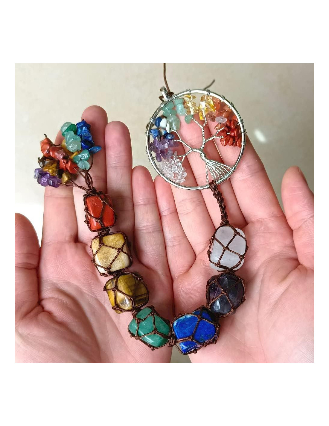 - [Cristales de Sanación de 7 Chakras]: Cuarzo Cristal Claro, Amatista, Lapislázuli, Aventurina Verde, Ojo de Tigre, Jaspe Amarillo, Ágata Roja. Tamaño del Árbol de la Vida: 4.5 pulgadas (11.43 cm), tamaño de las piedras pulidas: 18-20 mm, tamaño de las piedras trituradas: 5-8 mm. Longitud Total: 29-30.5 cm (11.5-12 pulgadas)
