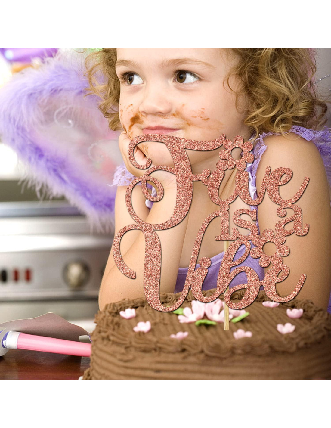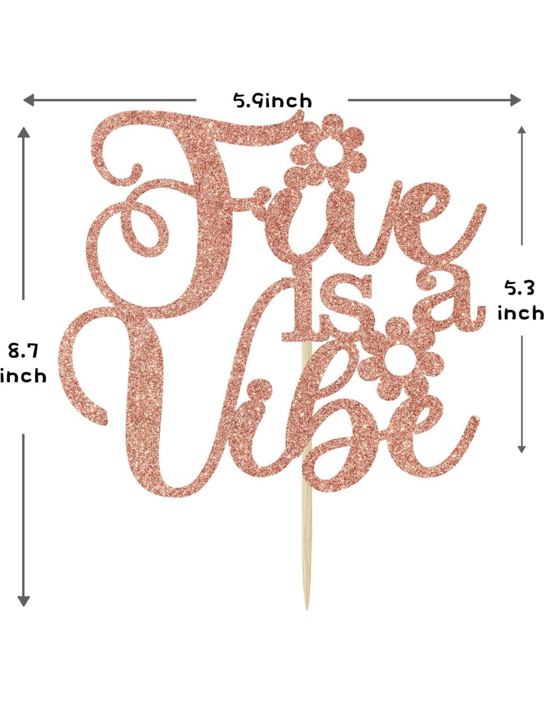 - [Diseño Groovy] : Presenta un cake topper de "Cinco es una Vibración" con un tema retro en brillo rosa oro, perfecto para una celebración de cumpleaños hippie de 5 años.