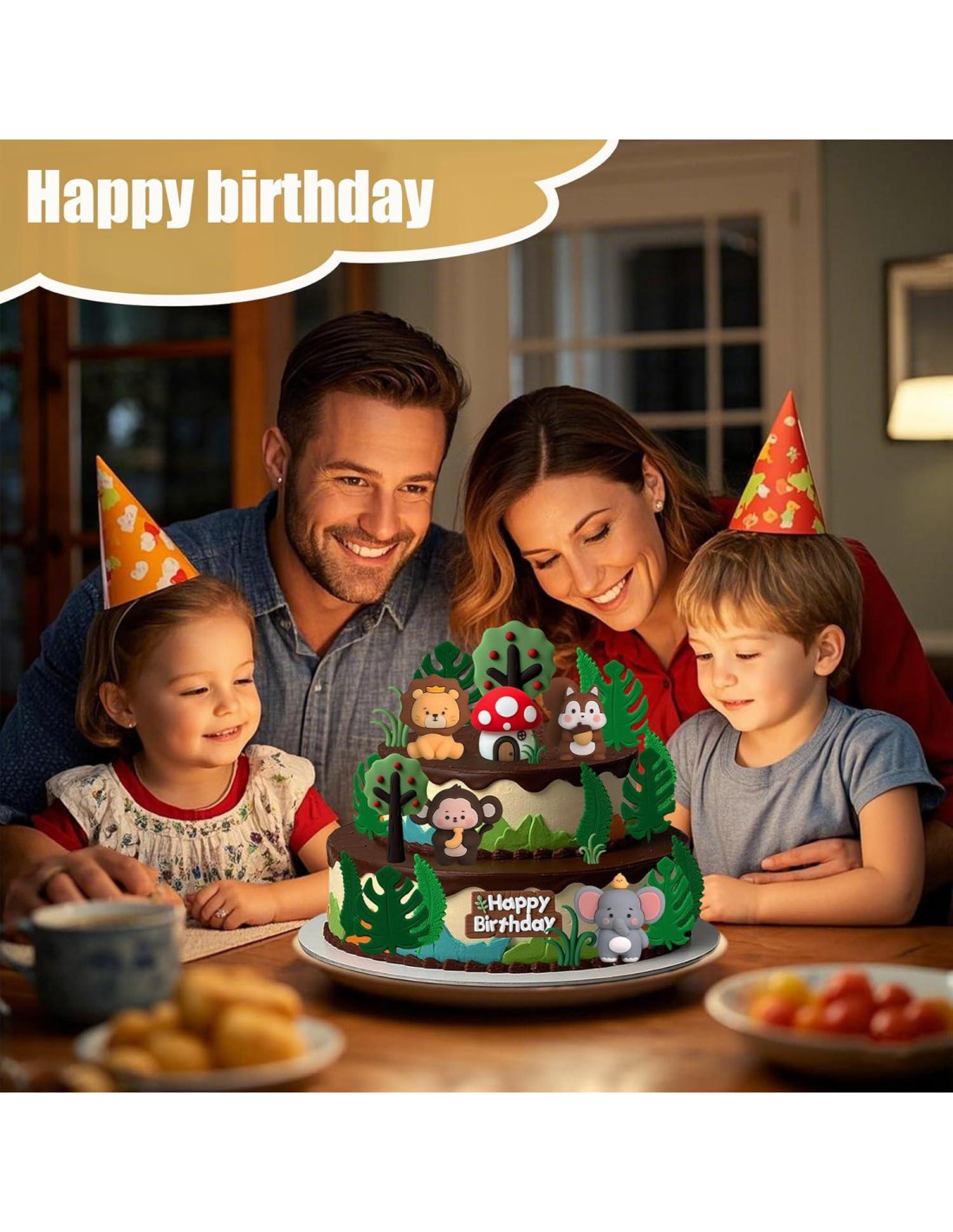 - [Juego de Adornos de Pastel Safari] Un total de 26 piezas, incluyendo 1 ardilla, 1 león, 1 mono, 1 elefante, 1 cabaña roja, 12 hojas de árbol, 2 árboles grandes, 3 letreros de cumpleaños y 4 parches de hierba