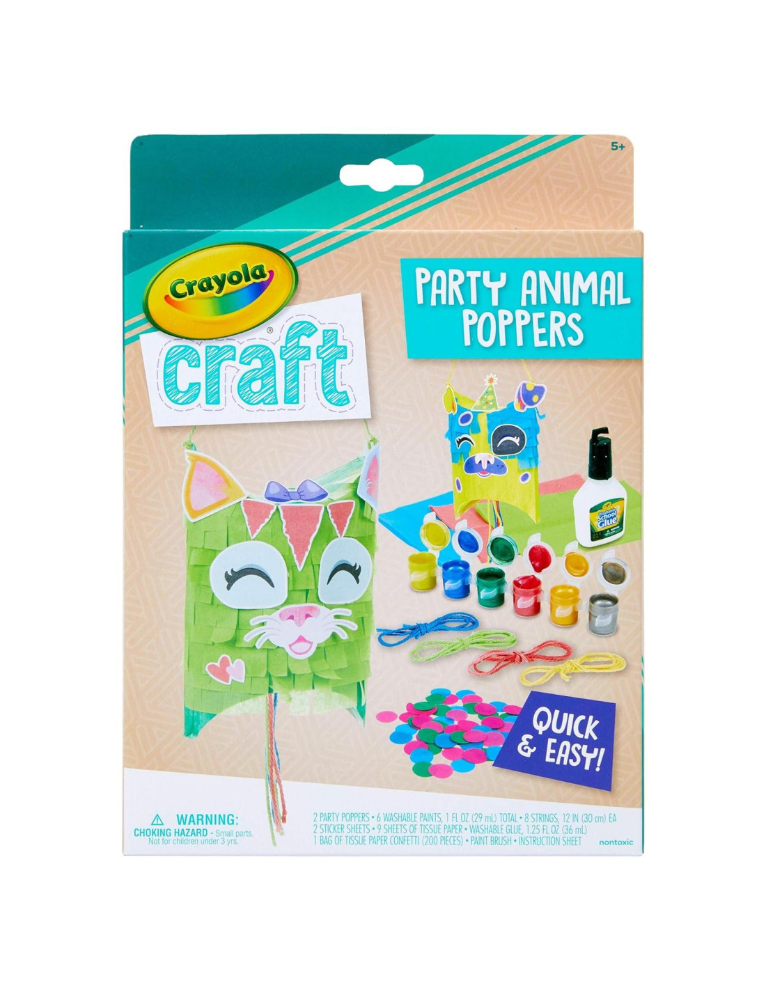Los sets de manualidades Crayola ofrecen a los niños y padres la solución todo en uno para proyectos de manualidades simples y hermosos. Con los Party Animal Poppers, los niños pueden ensamblar, pintar y decorar dos poppers de fiesta de confeti con caras de animales, luego tirar de las cuerdas para liberar el confeti. Este kit de manualidades para niños incluye 2 Bases de Cartón para Poppers de Fiesta, 6 Tarros de Pintura Metálica Lavable, 1 Pincel, 8 Cuerdas, 2 Hojas de Stickers, 9 Hojas de Papel de Seda, 1 Pegamento Lavable, 1 Bolsa de Confeti de Papel de Seda y una Hoja de Instrucciones. Hace una divertida actividad de manualidades para niños y niñas. Perfecto para niños de 5 años en adelante.
