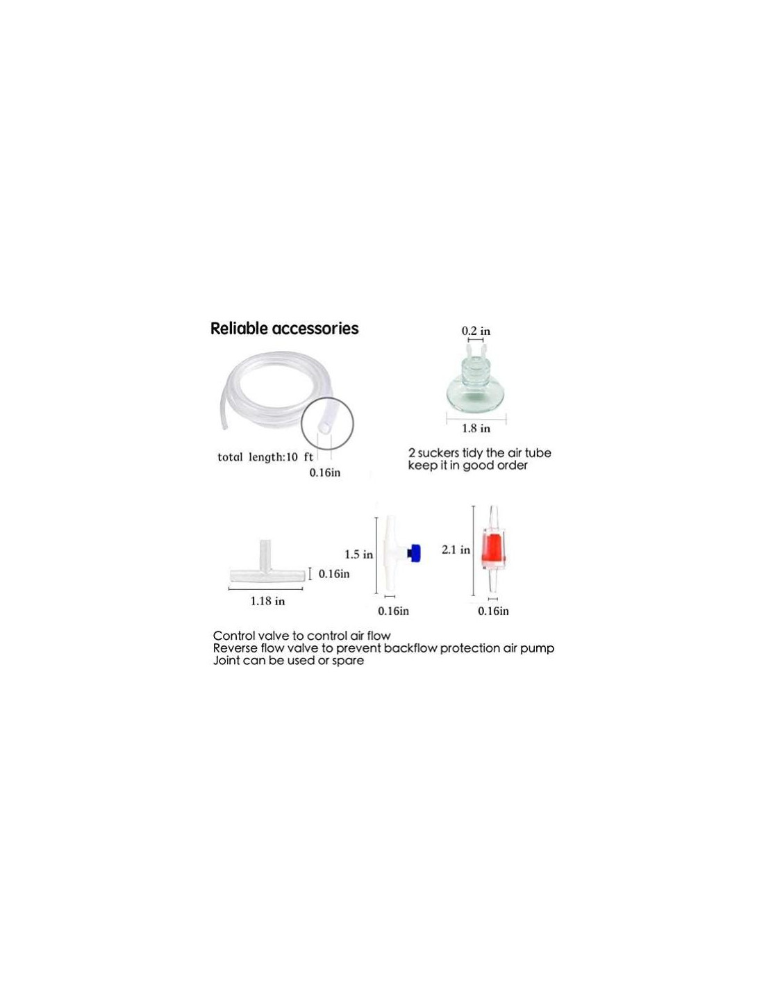 - El paquete incluye: 3 metros de tubo de aviación, 1 burbuja Groot, 2 ventosas, 1 válvula de retención, 1 conector en T y 1 válvula de control de aire. Todo el conjunto de accesorios es suficiente para conectarse a la bomba de aire.