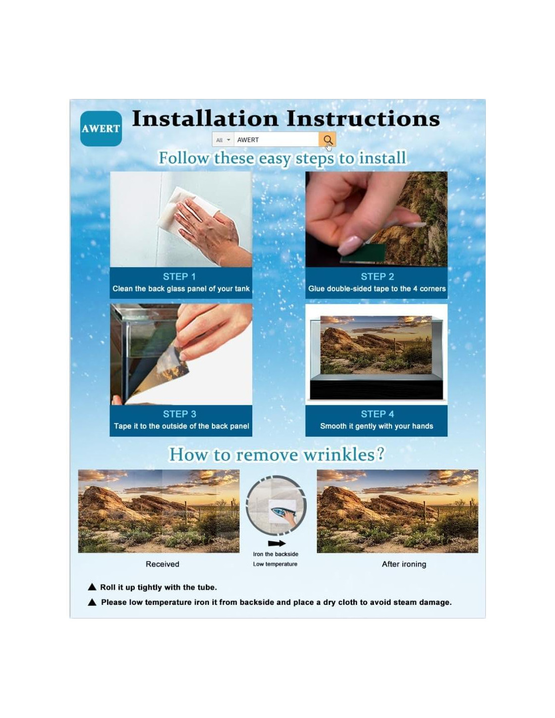 - Se adapta a la mayoría de los acuarios, terrarios, varios tamaños de carteles de fondo para elegir. Gran decoración para acuario y acuario. Fácil de instalar con las 8 piezas de cinta de doble cara EVA incluidas, lo que le permite configurar el fondo de manera segura y rápida