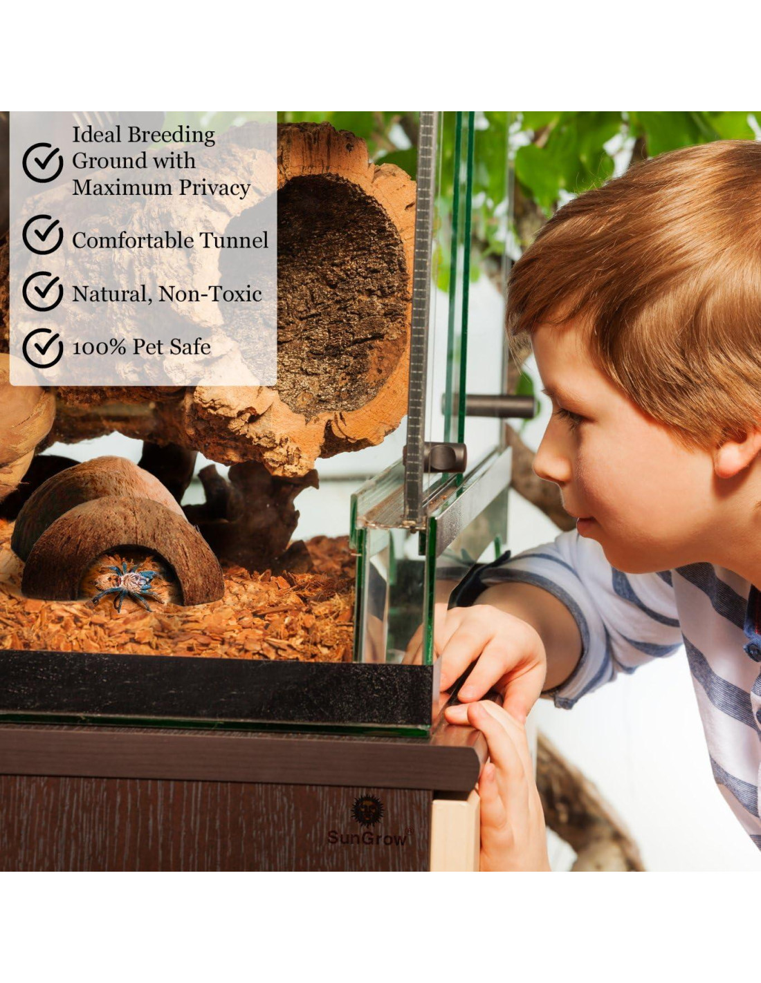 - Amplio túnel escondite --- El gran espacio de cada cáscara de coco (12.7 x 7.6 cm) proporciona un ambiente acogedor y cálido para que tu cangrejo ermitaño, geckos o lagartos se escondan, duerman y descansen. Un túnel hecho de los refugios de coco crea un gran refugio oscuro y cómodo, brindando a tu cangrejo una sensación de privacidad y seguridad.