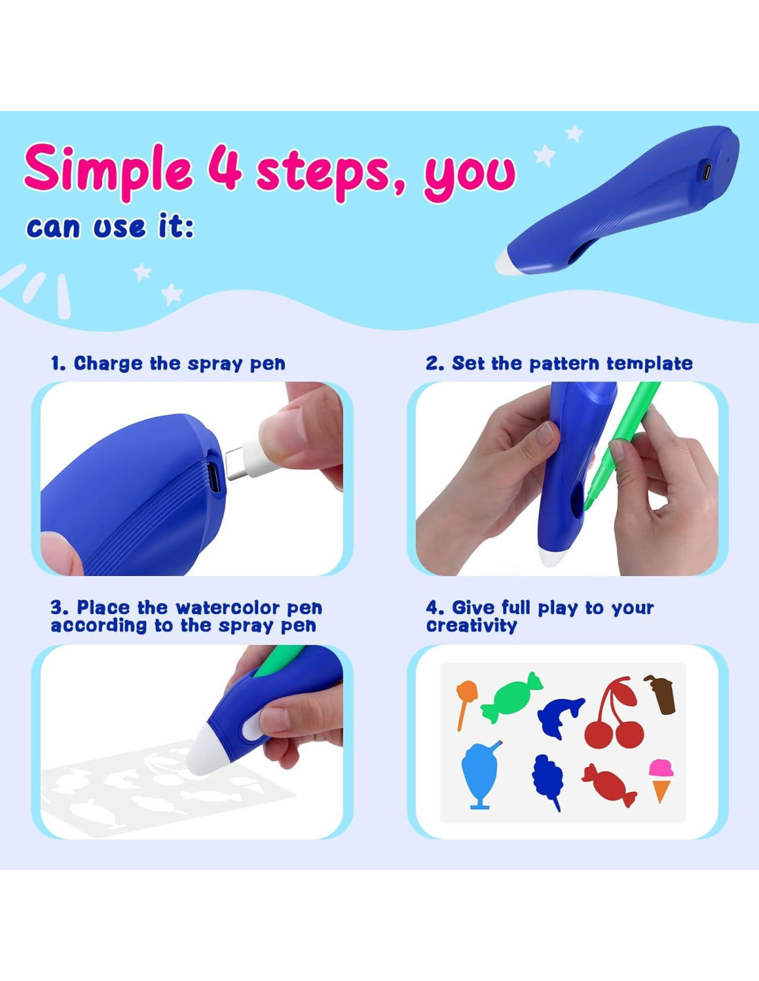 - [Set de pintura en spray creativa para niños] : Los sets mágicos para niños incluyen 1 cepillo de pintura en spray, 12 marcadores de acuarela de colores, set de papel de plantilla para pintura en spray, 1 cable de datos USB, desata la imaginación de tu hijo y convierte obras de arte ordinarias en obras maestras extraordinarias.