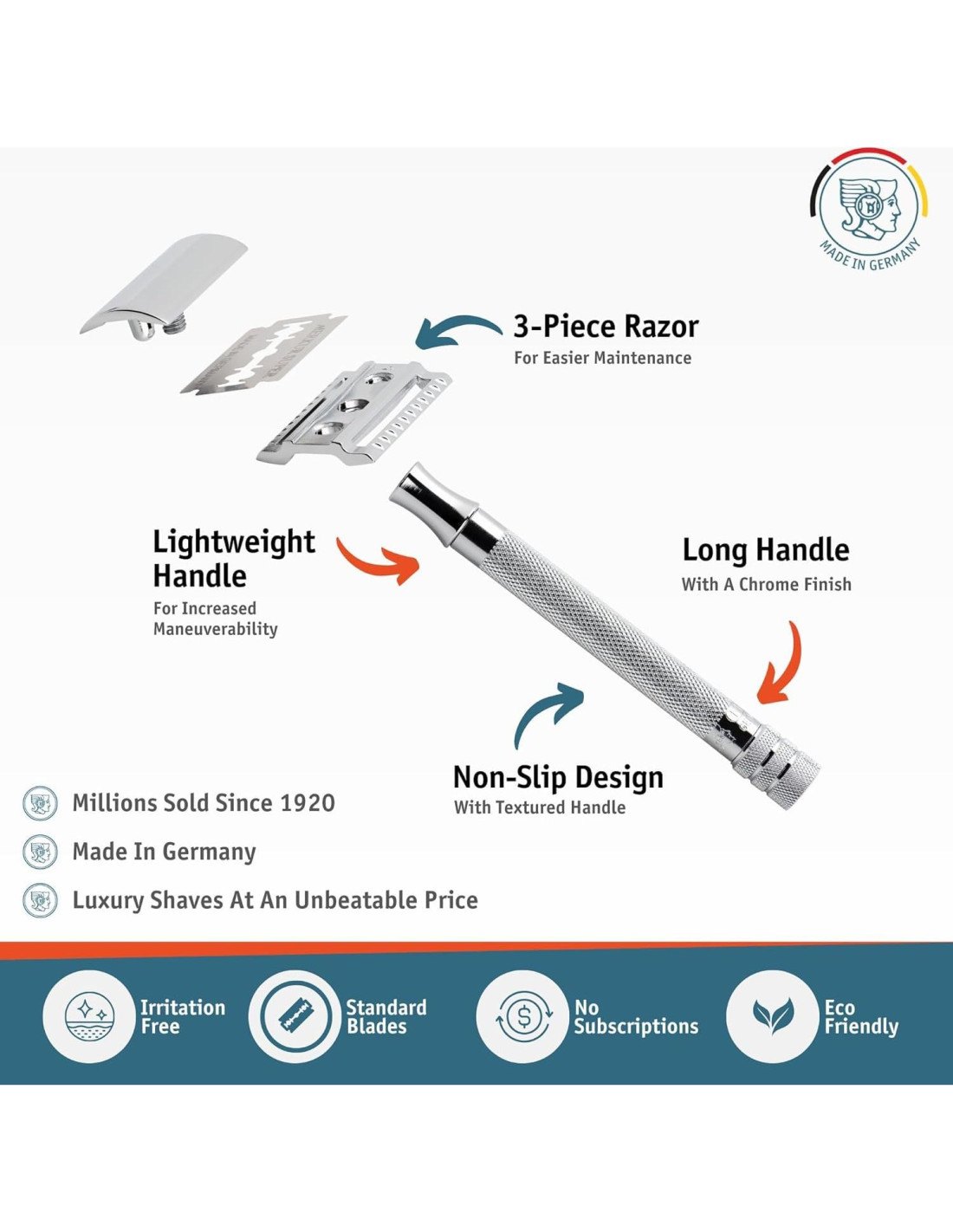 - La MERKUR 23C tiene un mango largo y texturizado que proporciona un agarre fuerte y un excelente control, especialmente para alguien con manos grandes. Su diseño de tres piezas ofrece una fácil limpieza y durabilidad duradera. Es amada por millones y es una de nuestras maquinillas de un solo filo más populares para hombres.