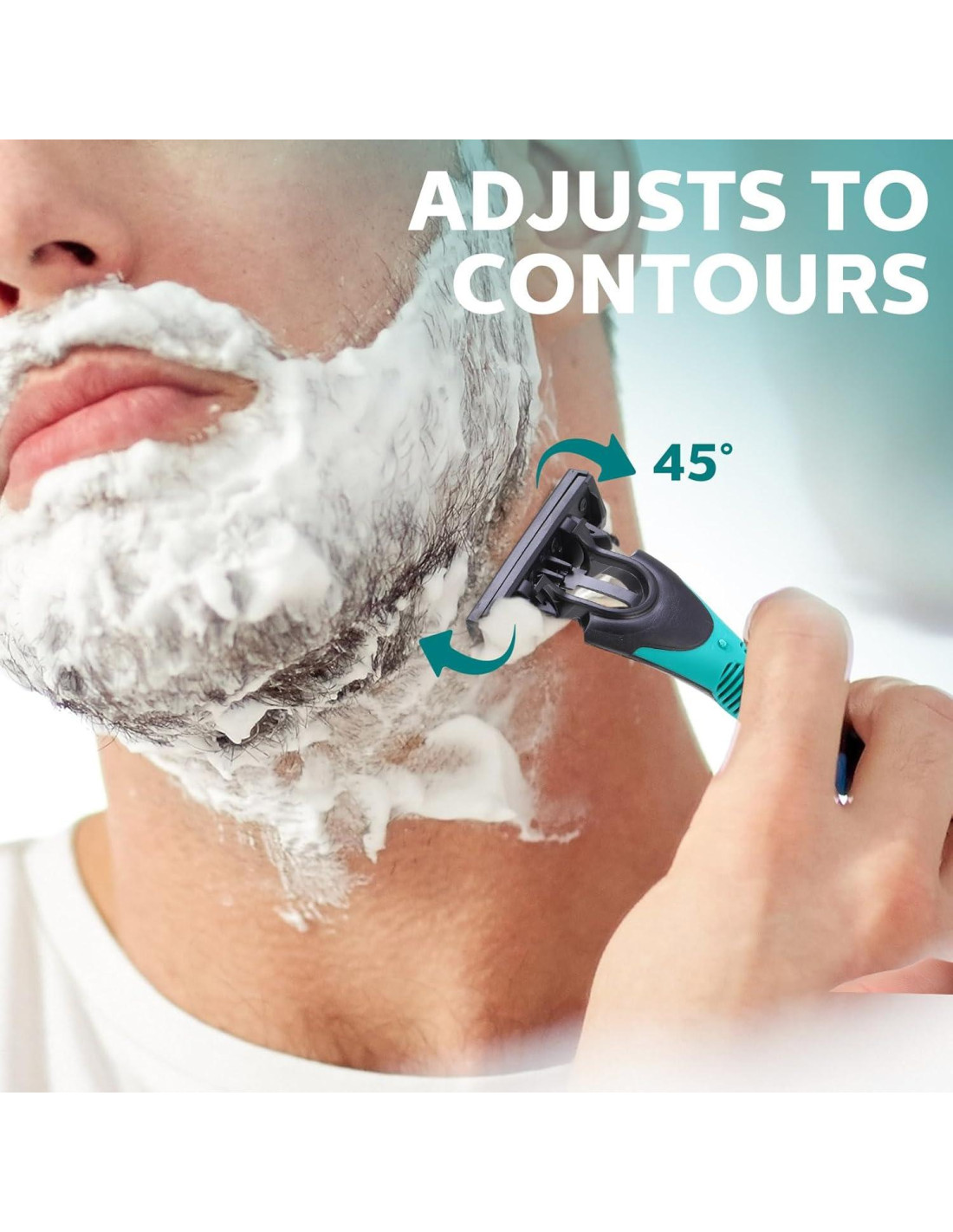 - Cabezal Rotatable: el cabezal de las afeitadoras desechables de 3 cuchillas puede rotar 40 grados, permitiéndote ajustarlo según tu cara para lograr un afeitado más cercano; Instrucciones de cuidado: después de usar, almacena las afeitadoras con las cuchillas hacia arriba (alejadas del agua) para permitir que la tira lubricante se seque