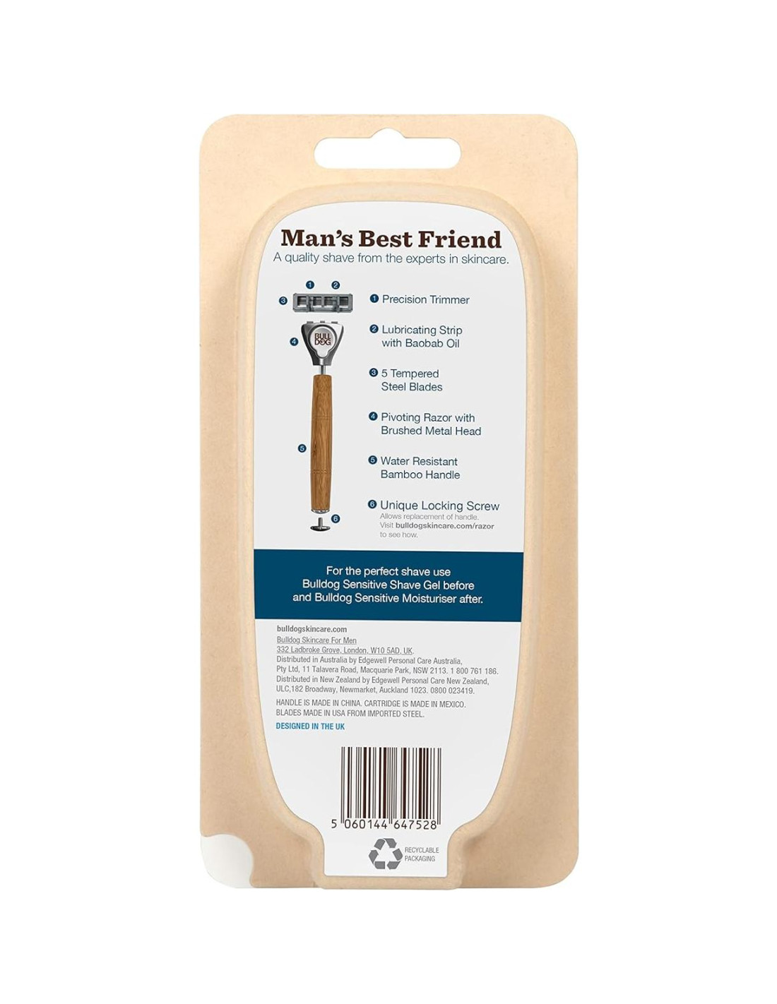 Algunas personas simplemente no fueron hechas para tener barba. Aquí está nuestra afeitadora de bambú sensible para ayudarte a trabajar con lo que tienes. Compruébalo. La afeitadora original de bambú de Bulldog Cuidado de la Piel tiene todo lo que necesitas para un gran afeitado. 5 cuchillas de acero templado, una tira lubricante con Baobab y un recortador de precisión con diseño pivotante. Lo que distingue a la afeitadora de bambú sensible es el enfoque en reducir su impacto ambiental. Desde el mango de bambú natural hasta los componentes metálicos sin cromo y el embalaje hecho de material completamente reciclado. Las características del producto incluyen; diseño pivotante (para un afeitado suave y cómodo), 5 cuchillas de acero templado, tira lubricante con Baobab, recortador de precisión, cabeza de metal cepillado, mango de bambú natural y un tornillo de bloqueo único (para reemplazar el mango de bambú) un afeitado de calidad de los expertos en cuidado de la piel.
