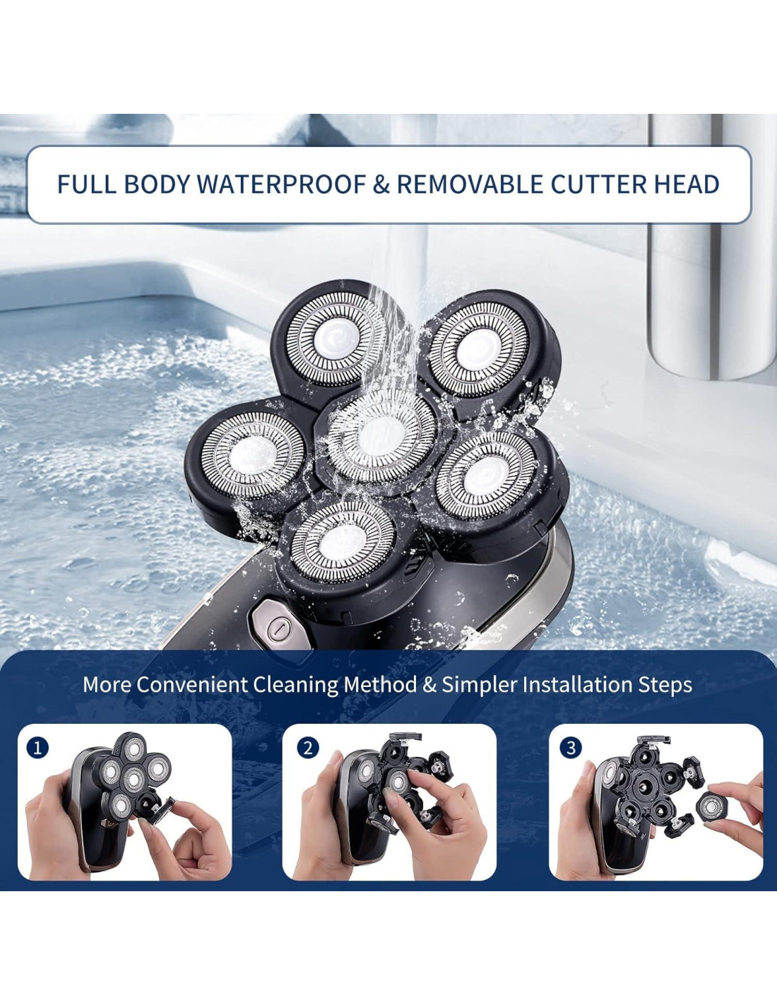 - Cabezal de afeitado flotante mejorado: Este cabezal de afeitadora eléctrica está diseñado con comodidad y precisión en mente, proporcionando un ajuste ceñido que se adapta a los contornos de tu rostro para un afeitado sin esfuerzo y satisfactorio. La afeitadora está equipada con seis cabezales de cuchillas flotantes duraderas que cubren un área más amplia para un afeitado más rápido. Además, también te proporcionamos dos cabezales de corte de repuesto adicionales, que pueden ayudarte a reemplazarlos en cualquier momento y ahorrar dinero.
