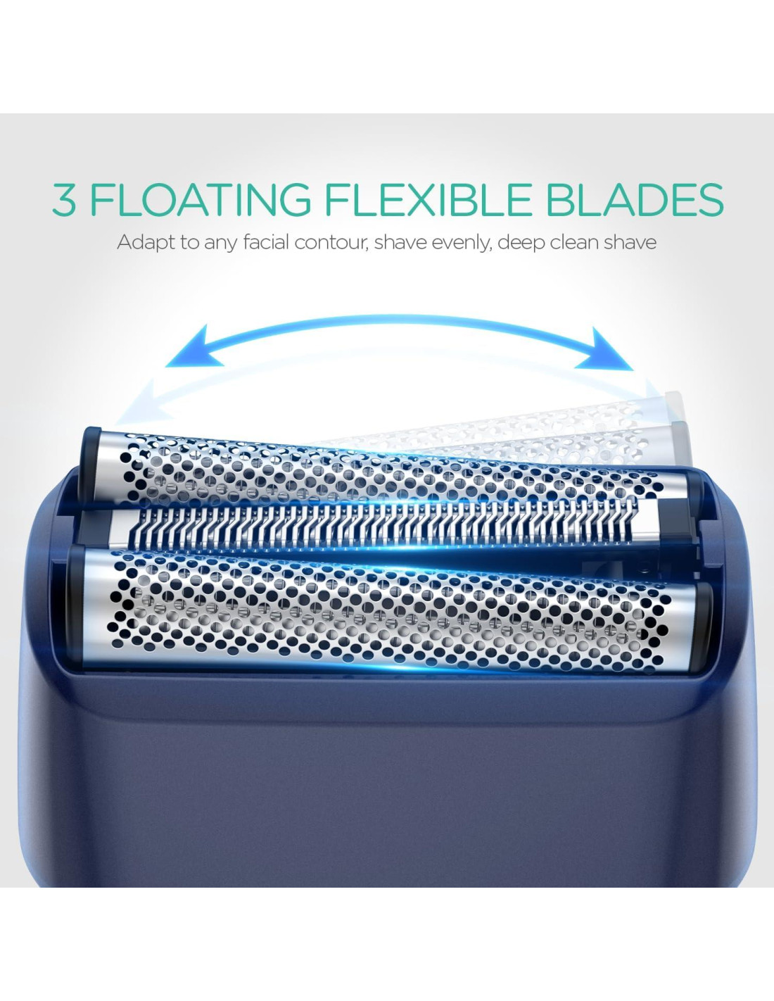 - Cuchillas flotantes triples: La afeitadora de lámina incluye dos mallas de cuchilla flotantes y un recortador en forma de diente de tiburón en el medio. La altura de las tres cuchillas está dispuesta en secuencia, lo que se adapta perfectamente al contorno facial y puede recortar vellos largos que son difíciles de afeitar, y puede refinar la barba más corta. Suave sin tirar del vello para un afeitado eficiente y suave.