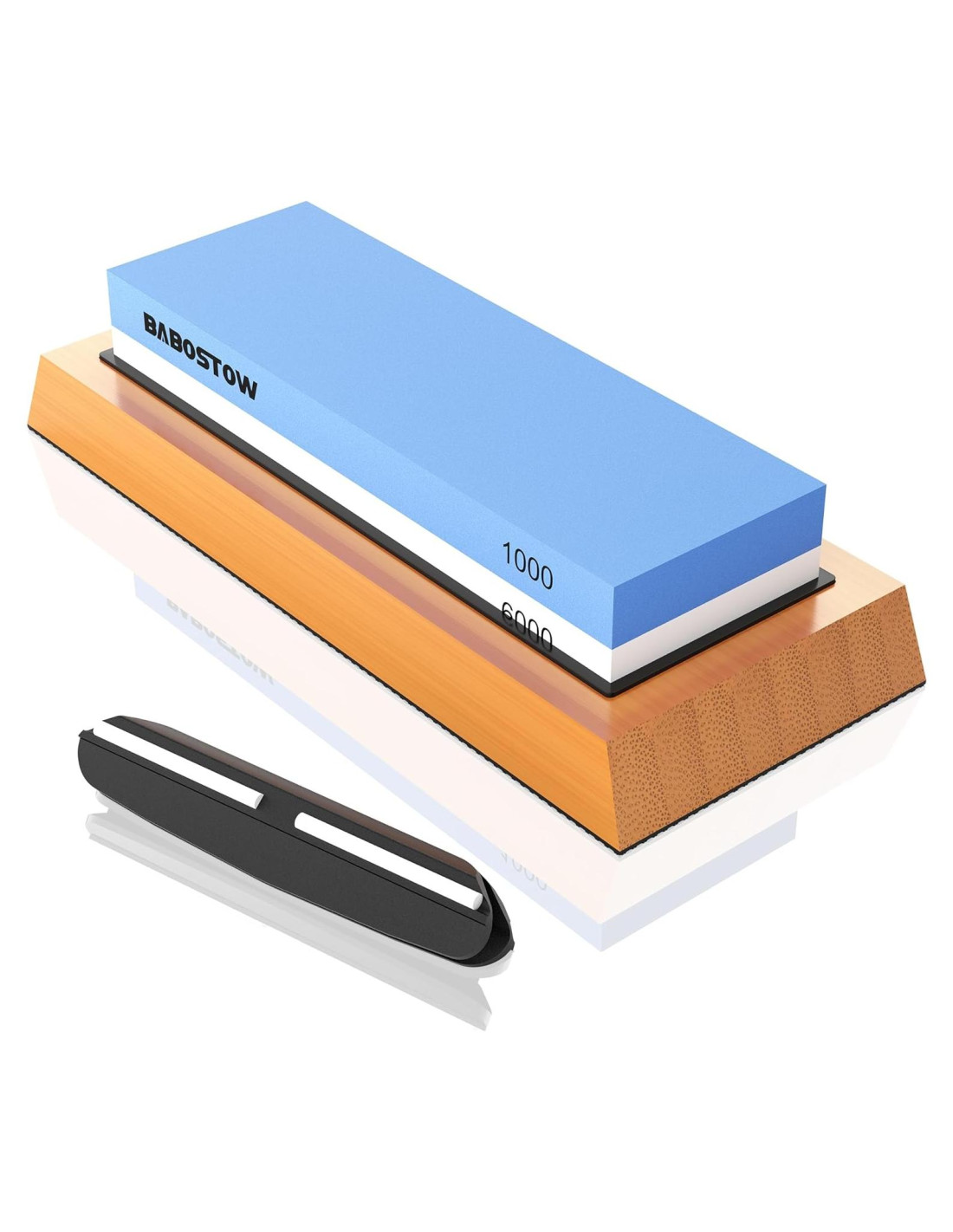 - [Paquete Superior] El kit de afilado de cuchillos BABOSTOW viene con un afilador de piedra de doble cara (#1000 / #6000), una base de bambú resistente para sostener la piedra, una guía de ángulo para afilar cuchillos, un manual de instrucciones simple y un ebook detallado con muchos consejos y trucos que atraerán a todos los niveles de habilidad